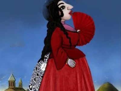 Художник Александра Павлова создает на сцене настоящий грузинский городок, где террасы увиты плющами, а закат и рассвет как заправский живописец окрашивают гору.