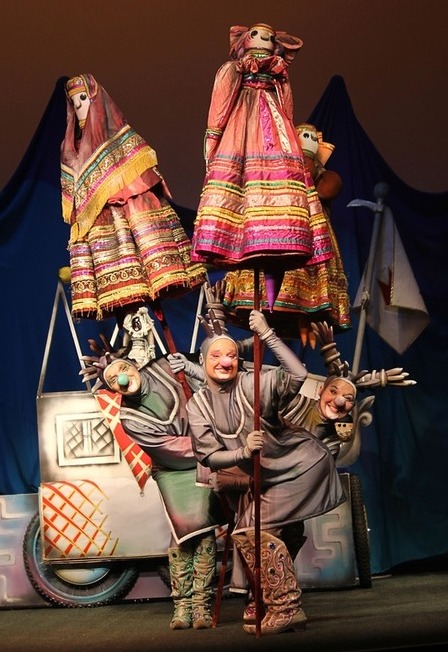 На сцене рядом работают актеры и куклы (открытый приём игры).
