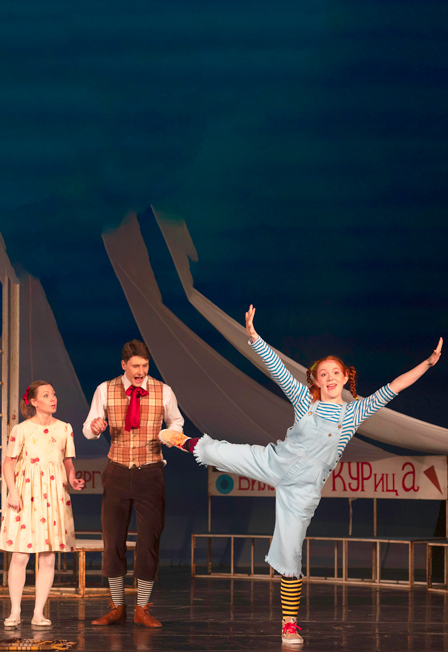 Весёлое представление про удивительную девочкуАвтор: Астрид ЛиндгренРежиссёр: Михаил ЛевшинАктёры: Томми - Игорь Ключников/Павел ПутрикАнника- Ольга Иванова/Дарина ОдинцоваЧлены родительского комитета:Фрекен Розенблюм - Любовь ЗавадскаяФру Сеттергрен - Татьяна Болдина/Татьяна ВерховскаяФру Лаура Бертгрен - Светлана Шаврова Жулики:Блом - Антон СиданченкоГромила Карл - Александр ЛеднёвПолицейский - Максим Зауторов/Сергей ШапошниковДиректор цирка - Евгений Тележкин Клоуны:Белый - Александр Безруков/Сергей МатвеевРыжий - Сергей Колос/Сергей ЯкушевИндийский петух - Максим Зауторов/Николай КраснопёровМать Томми и Анники - Татьяна БолдинаКапитан Длинныйчулок - Игорь Павлов/Сергей МосьпанЭта фантазерка, хулиганка, одновременно дерзкая и веселая маленькая девочка с детства знакома всем из одноименного произведения Астрид Линдгрен. Зрителей ждет встреча с отважной и озорной Пеппи, которая совсем не похожа на остальных детей маленького городка, куда она приехала после того, как ее папа, капитан Эфроим, пропал во время шторма. Читать и писать непоседливая Пеппи не умеет, зато она все время выдумывает невероятные истории, лазает по канатам и вообще все делает наоборот. Конечно, этим она ужасно досаждает всем взрослым жителям города. И пускай она слишком отличается от остальных, воспитанных и опрятных детей, жизнь в этой маленькой девочке льется через край. Для Пеппи самое важное — это всегда радоваться жизни и быть открытой для новых впечатлений и приключений. С отважным сердцем и бурной фантазией она путешествует по далеким странам, которых даже нет ни на одной карте мира. А все свои подвиги Пеппи совершает во имя дружбы и справедливости. Вечная молодость — это рецепт её хорошего настроения. Скучать в компании такой оптимистки невозможно. Зрители вместе с маленькой смелой Пеппи переживают невероятные приключения: им придется столкнуться с жуликами, которые охотятся за чемоданом с сокровищами. Они увидят строгую фрёкен Розенблюм, директора цирка дрессированных детей, которые попытаются отдать хулиганку-Пеппи в приют. Но эта находчивая и обаятельная девочка окружена друзьями, и поэтому не боится ничего на свете! . Продолжительность: 1 час 40 минут. Спектакль идёт с одним