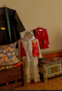 В зале представлены экспонаты, принадлежащие различным культурам: казахский свадебный костюм мужчины, люлька, кесайки, миниатюрная юрта, головные уборы, сандык-казахский сундук, и многое другое.