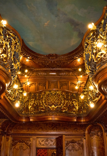 Высокие окна, зеркала, витражи, дубовая резьба, мрамор, бронза, шелк — всё подлинное, нетронутое временем.