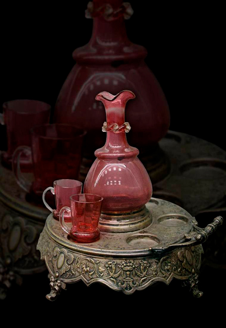 В витрине представлены изделия из стекла, фарфора и металла в популярном в начале XX в.