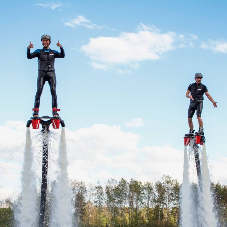 Полет на Флайборде дарит незабываемые ощущения. Развлечение, совмещенной с физической нагрузкой. Обретение новых навыков и впечатлений — это эмоции, которые запомнятся на всю жизнь! Флайборд — это устройство, которое позволяет человеку плавать-нырять-взлетать., Конструкция флайборда позволяет взлетать над поверхностью воды на высоту до 9 метров, кувыркаться в воздухе и плыть сквозь волны!, На флайборде можно выполнять различные гимнастические и акробатические трюки..