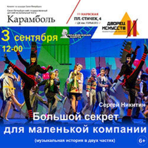 В спектакле прозвучат хорошо известные и новые, специально созданные для театра «Карамболь», песни С.Никитина на стихи Ю.Мориц. Веселые и трогательные, такие как, «Резиновый ёжик», «Собака бывает кусачей только от жизни собачей», и, конечно, «Большой секрет для маленькой компании», наверняка захочется спеть юным зрителям вместе с героями нашей истории. А мамам и папам, бабушкам и дедушкам мы даем возможность вспомнить свое детство, улыбнуться или смахнуть с глаз слезинку…