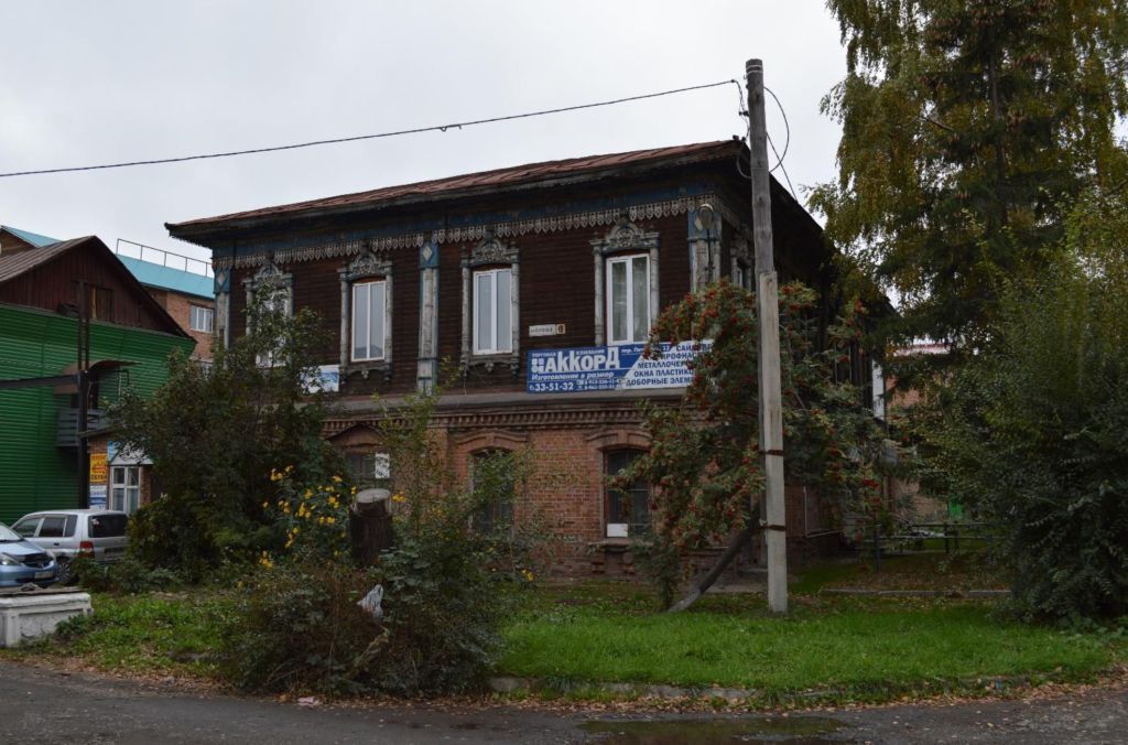 1. Градостроительная характеристика. Здание расположено в исторической части города Бийска. Продольным северо-западным фасадом выходит на красную линию улицы Чкалова, северо-восточным фасадом – на красную линию застройки переулка Почтового. 2. Объемно-планировочное решение. Двухэтажный прямоугольный в плане дом, кирпичный в первом этаже, деревянный – во втором, с четырехскатной кровлей. Вход в здание осуществляется с дворового юго-восточного фасада.В основе планировки помещений лежит одна продольная и три по-перечных стены, которые делят основной объем на равновеликие помещения с коридором в северо-восточной части здания.3. Конструктивные особенности. Стены первого этажа из лицевого кирпича с элементами фигурной кладки, второго – бревенчатые рублены без «остатка». Крыша – четырех-скатная с кровлей из листового металла. Водосток организованный. 4. Декоративное оформление фасадов.Первый этаж здания оформлен с помощью кирпичного декора. Второй этаж декорирован накладной и пропильной резьбой. Оформление фа-садов подчеркивается сильно вынесенным карнизом и фризом дополненными ажурной пропильной резьбой. Кирпичный уступчатый междуэтажный пояс декорирован по главным фасадам двумя рядами сухариков. Углы здания и выходы капитальных стен подчеркнуты лопатками, которые в нижнем этаже украшены элементами геометрического рисунка, размещенными внутри филенок, во втором – накладными крупными эле-ментами и токарными полуколонками, повторяющимися на наличниках.Главный северо-западный фасад делится лопатками на четыре равные части по две оси оконных проемов в каждой, за исключением второго слева прясла, где в обоих этажах размещены трехчастные окна.Торцевые северо-восточный и юго-западный фасады по центру раз-делены лопатками, с двумя осями оконных проемов в каждой части. Дворовый юго-восточный фасад разделен по центру плоской лопат-кой только в уровне 1-го этажа. В правой части 2-го этажа устроен тройной оконный проем.Окна первого этажа лучковые, обрамлены наличниками простой формы, дополненными замковыми камнями, ушками с треугольными свесами и полочками вверху. Подоконное пространство отделено полочками, по главным фасадам кирпичным декором с треугольными свесами. Окна второго этажа более высокие, лучковой формы, декорированы наличниками с объемной резьбой. Фигурные очелья с полукруглым за-вершением увенчаны пятью токарными шишками разной величины, включают глухую резьбу с мотивами виноградной лозы, гроздьев и розой в центре. Вертикали наличников оформлены токарными элементами в виде полуколонок, обработанных резьбой растительного рисунка и дополнены внизу шишками. Криволинейные фартуки декорированы волютами с трилистником.Все окна с Т-образной расстекловкой.Деревянный декор 2-го этажа окрашен в два колера.Общая оценка общественной, научно-исторической и художествен-ной значимости памятникаЖилой дом начала XX века, выполненный в формах эклектики с богатой пластикой глухой резьбы в наличниках. Формирует перекрёсток двух улиц исторического центра города Бийска.