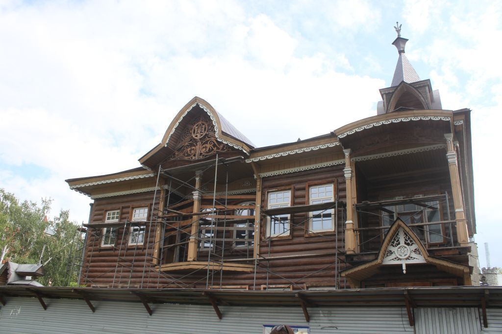 1. Градостроительные характеристики: здание расположено в исторической части города, с отступом от красной линии проспекта Красноармейского (бывший пер. Конюшенный). 2. Объемно-планировочное решение здания: бревенчатое здание в плане близкое к П-образному имеет живописное объемно-пространственное решение с несколькими композиционными осями по главному фасаду, акцентированных лоджиями, фронтонами и шатровой башенкой. 3. Конструктивные особенности здания: бревенчатый сруб, рубленный в лапу; стропильная крыша с кровлей из листового металла, водосток организованный с помощью водосточных труб. Декоративное оформление фасадов: Стены завершает большого выноса карниз с подзором и фриз из вертикально поставленных тесин, также украшенный резьбой.Главный западный фасад с семью осями проемов имеет двухчастное построение, где выделена правая фланговая ось. Здесь в уровне первого этажа расположен парадный вход, состоящий из высоких дверей и симметрично расположенных узких окон. Над входом размешен ажурный килевидный козырек на деревянных кронштейнах, во втором этаже - глубокая лоджия с обрамлением из пропильной резьбы растительного рисунка. Лоджию фланкируют две колонны квадратного сечения с накладным декором, на которые опирается дугообразный козырек. По этой же оси возвышается двухъярусная башня с шатром, увенчанным фонариком с крестоцветом. Во втором ярусе башни имеются четыре крупные стрельчатые арки, декорированные подзорами и опирающимися на небольшие резные кронштейны.Центр фасада в 2 оконные оси акцентирован большим килевидным щипцом с резным заполнением тимпана и лоджией с треугольной выносной площадкой в плане, декорированной подзорами. По центральной оси площадки лоджии - колонна квадратного сечения, декорированная накладной резьбой, на которую опирается основание фронтона в виде двух арок небольшого подъема. По обе стороны от фронтона на кровле устроены два небольших треугольных слуховых окна. В уровне 1-го этажа - 2 оси сдвоенных окон, в уровне 2-го этажа в центральной лоджии, у более широких окон криволинейная расстекловка характерная для модерна.Основная часть окон - прямоугольные с фрамугами, имеют мелкую расстекловку, обрамлены наличниками с широкими фартуками, украшенными на 1-м этаже ажурной накладной резьбой, на 2-м этаже - тремя филенками. Ажурное ограждение лоджий выполнено из пропильной резьбы.Декоративное убранство остальных фасадов сдержанно. Юго-восточный фасад завершен треугольным фронтоном, формирующим скаты крыши, в вершине которого размещена башня с шатром (см. выше). По обе стороны от башни - объемные двухскатные слуховые окна, украшенные подзорами, обращены на юго-западный и северо-восточный фасады. Карнизы фронтона декорированы аналогично основным карнизам, в тимпане - трехчастное чердачное окно. По северо-западному фасаду устроены дополнительный вход и небольшой балкон, утраченный ныне. Линия карниза прерывается небольшим килевидным фронтоном с круглым слуховым окном декорированным накладной резьбой в виде солнца.К северному фасаду, продолжая главный фасад, примыкает декоративная ограда с резными воротами, выполненными в одной стилистике с убранством фасадов.Деревянные декоративные элементы фасадов окрашены в 2 колера: желтая охра - поле наличников, колонны и ограждение балконо