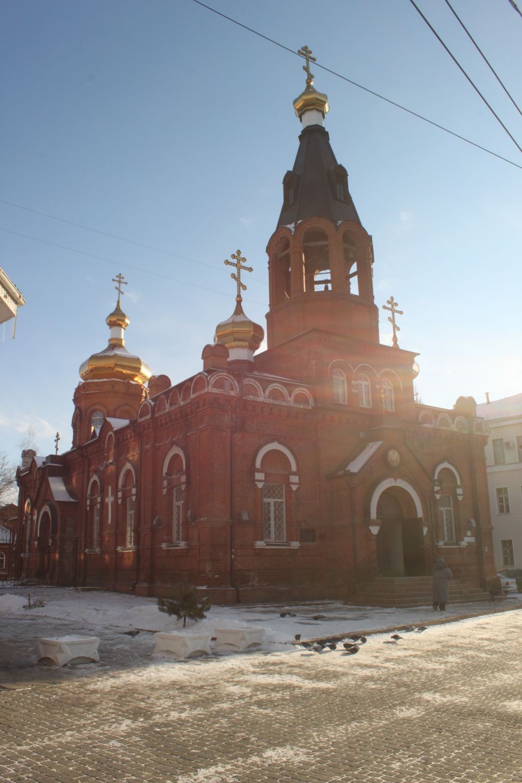1. Градостроительная характеристика. 1.1. Местоположение: в квартале, ограниченном ул. Чкалова и ул. Партизанской с отступом от красной линии застройки пр-кта Ленина, под углом направления проспекта;к северо-западу от объекта культурного наследия «Комплекс: Казармы Барнаульского стрелкового полка».1.2. Планировочная характеристика:здание храма условно ориентировано с востока на запад;условно западный фасад обращен на пр-кт Ленина.2. Объёмно-планировочное решение: 2.1. Объемно-пространственное решение и габариты здания:принадлежит к типу однонефных базиликальных храмов: прямоугольное в плане здание, усложненное в условно восточной части двухсветным объемом по центральной оси: восьмерик на четверике, завершенные сложной главой, и симметрично расположенными одноэтажными объемами; основной объем – в 1 ярус, дополнен в западной части двухярусным объемом звонницы (восьмерик на четверике) завершенным шатром с главкой.2.2. Планировочное решение в соответствии с канонами русской православной церкви: три части: притвор в западной части, основное помещение храма (средняя вытянутая часть) и алтарь в восточной части;в западной части – антресоль хоров, на которую ведет винтовая лестница;порталы входов: по центрам западного, северного и южного фасадов, а также в пристрой дьяконника по южному фасаду.3. Оформление фасадов: 3.1. Композиции фасадов:композиция условно западного фасада симметрична;по центральной оси – портал фигурного завершения, напоминающего щипец, где размещен полуциркульный дверной проем с архивольтом килевидного завершения на полуколоннах; по центральной оси – квадратное основание колокольни (четверик) с тремя арочными оконными проемами, по сторонам от которого небольшие глухие главки;выше – восьмигранная в плане (восьмерик) открытая звонница с арочными проемами, завершенная шатром с главкой и крестом;симметричная композиция условно восточного фасада, сформированная пристроенными объемами алтарной части;по центральной оси – пятигранная апсида;над карнизом основного объема храма – квадратный в плане объем основания второго света алтарной части, продолженный восьмигранным в плане объемом второго света, завершенным сложной главой с крестом;слева и справа от апсиды небольшие идентичные объемы ризницы и дьяконника; условно южный и северный фасады с зеркально-симметричной композицией.3.2. Элементы декоративного оформления фасадов, выполненные в лицевой кирпичной кладке с применением лекального кирпича:карниз, декорированный рельефной линией подзора в «зуб»;фриз с прямоугольными заглублениями; две выступающие тяги по нижнему уровню окон и выступающий цоколь по периметру фасадов;лопатки с прямоугольными заглублениями - филенками, оформляющие углы здания и алтарную часть; широкие лопатки с изображениями крестов, завершенные кокошниками над линией карниза, по условно южному и северному фасадам;заглубленные рустованные линии ниже окон;оформление дверных, оконных проемов и киота восточного фасада в виде массивных полуколонок с перехватами и арочным архивольтом с килевидным завершением;3.3. Декоративные элементы в уровне крыши:восьмигранный шатер звонницы с четырьмя слуховыми окнами с кровлей «в шашку», завершенный небольшой луковичной главкой с крестом;две глухие восьмигранные главки с крестами, симметри