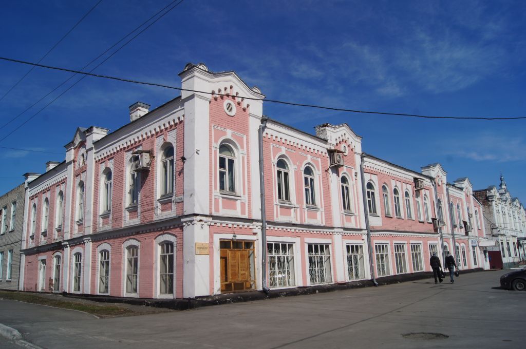 1. Градостроительная характеристика.Здание расположено в исторической части города Бийска, на пересечении улицы Советской и переулка Турусова. Главный юго-восточный фасад обращен на красную линию улицы Советской, юго-западный фасад на переулок Турусова. 2. Объемно-пространственное решение. Двухэтажное здание, основной объем прямоугольной в плане формы с ризалитом небольшого выноса со стороны правого фланга дворового северо-западного фасада. К левому флангу дворового фасада, с небольшим смещением от угла здания, пристроен протяженный прямоугольный в плане одноэтажный объем. К основному зданию со стороны левого фланга бокового северо-восточного фасада примыкает объем лестничной клетки, через него со стороны улицы Советской осуществляется главный вход в здание.3. Конструктивные особенности.Стены выполнены из красного керамического кирпича лицевой кладки, окрашены, поверхности оконных ниш оштукатурены и окрашены. Крыша основного объема вальмовая сложной конфигурации четырехскатная, над лестничной клеткой – односкатная, одноэтажного объема – двускатная. Кровельное покрытие выполнено из листового металла. 4. Композиция и художественное оформление фасадов. Декоративное убранство имеют преимущественно уличные юго-восточный и юго-западный фасады. Выступающий полукруглый цоколь проходит по периметру здания, со стороны юго-западного фасада частично скрыт уровнем земли. Горизонтальное членение фасадов подчеркнуто профилированным карнизом небольшого выноса, переходящим в ряд арочек в уровне фриза и прерывающимся в местах расположения аттиков. Межэтажный карниз включает пояс из зубчиков, расскрепованный на лопатках. Окна второго этажа – арочной формы, первого этажа – лучковой. Композиция юго-восточного фасада основного здания, ориентированного на улицу Советскую, выполнена в четырнадцать осей проемов на втором этаже и двенадцать осей на первом. Четвертая, одиннадцатая и фланговые оси фасада выделены лопатками, завершенными в уровне кровли парапетными тумбами с полукруглыми кровельками, акцентированы фигурными щипцовыми аттиками с треугольными завершениями по центру. Тимпаны аттиков декорированы круглыми слуховыми окнами и спусками в виде арок. Арочные окна, расположенные по осям аттиков, заглублены в прямоугольные ниши, декорированные профилированными поясками, обрамлены арочными наличниками с замковыми камнями. Под окнами размещены вертикальные и горизонтальные филенки. Между осями аттиков расположено по два оконных арочных проема, размещенных в нише с аналогичным декоративным оформлением. Центральная часть фасада выполнена в шесть осей арочных проемов, каждый размещен в нише прямоугольной формы и завершен замковым камнем, кроме двух окон, расположенных по шестой и девятой осям и не имеющих декоративного оформления. По осям этих двух окон в уровне кровли расположены парапетные тумбы. Двухстворчатые окна с фрамугой, имеющей оригинальный переплет в форме кругов, выполнены с расстекловкой Т-образной формы. Каждая из створок разделена на три неравные части. В уровне первого этажа устроены окна лучковой формы, заглубленные в филенчатые ниши аналогичной формы. Пятая и восьмая оси акцентированы входными проемами. Окна имеют Т-образной формы расстекловку с фрамугой, разделенной на три части. Главный вх