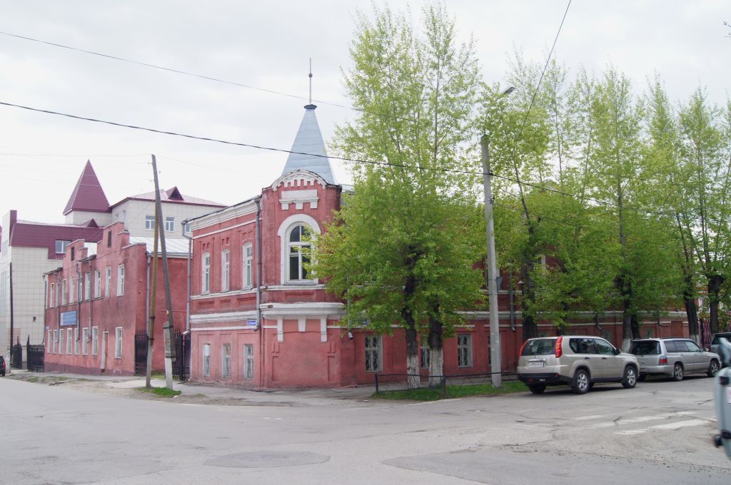 1.Градостроительная характеристика, местоположение: на пересечении ул. Ползунова и ул. Максима Горького:оформляет угол квартала, главным фасадом обращено на ул. Ползунова.2.Объемно-планировочное решение:2.1. Объемно-пространственное решение:несколько двухэтажных объемов, соединенных между собой по длинной стороне, образуют 2 внутренних дворика ориентированных в стороны улиц;угловой прямоугольный в плане объем имеет срезанный угол, завершенный шатром;прямоугольный в плане флигель обращен торцевым фасадом на ул. Ползунова.2.2. Планировочное решение:планировка в конструкциях капитальных стен;входы (или их имитация) – по правой оси главного фасада и в месте срезанного угла основного объема;3. Оформление фасадов:3.1. Композиции фасадов:3.1.1. Фасады углового объема:главный северо-западный фасад ориентированный вдоль ул. Ползунова: симметричная основная часть в 8 осей проемов, акцентирована по центру треугольным аттиком со слуховым окном, дополнен по правому флангу осью пристройки входного узла, завершенной невысоким прямоугольным аттиком;северо-восточный фасад ориентированный по ул. Максима Горького: 3 оси проемов с равным шагом;фасад срезанного угла: ризалит в 1 ось, завершенный над карнизом аттиковой стенкой и акцентированный шатром, в уровне 1 этажа портал входа в здание. 3.1.2. Торцевой фасад флигеля ориентированный вдоль ул. Ползунова: симметричный в 3 оси проемов, завершенный прямой аттиковой стенкой.3.2. Элементы декоративного оформления фасадов: фланкирующие филенчатые лопатки;широкие наличники окон 2 этажа;междуэтажный пояс из тянутых профилей с филенками;венчающий профилированный карниз малого вылета;лучковые окна 2 этажа увенчанные сандриками с филенками;декоративное оформление торцевого фасада флигеля ориентированного по ул. Ползунова, симметричная композиция в 3 оси проёмов завершена аттиком с декоративными элементами;фланкирующие филенчатые лопатки;широкие наличники окон 2 этажа;междуэтажный пояс из тянутых профилей с филенками фасадов основного объема;венчающий профильный карниз малого вылета, фриз фасадов основного объема;междуэтажный пояс дополненный зубчиками по главному фасаду флигеля;сандрики и филенки лучковых окон 2 этажа основного здания;широкие наличники прямоугольных окон 2 этажа флигеля;наличник полуциркульного окна 2 этажа ризалита срезанного угла:проем 1 этажа с выделенным замковым камнем;треугольный аттик со слуховым окном и прямой аттик, оформленные поясами тянутой формы;аттик лучковой формы ризалита срезанного угла, дополненный декоративными элементами;двойной аттик флигеля с акцентом по центру в виде кокошника.3.3. Рисунок оконного заполнения:Т-образная с выделением фрамуг.4. Конструктивные особенности здания:кирпичные стены оштукатурены и окрашены;вальмовая крыша с кровлей из листового металла;водосток организован с помощью водосточных труб.5. Общая оценка общественной, исторической и художественной значимости памятника: пример здания конца XIX – начала XX веков.
