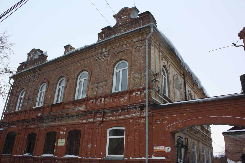 1. Градостроительная характеристика. Здание расположено в исторической части города, главным югозападным фасадом ориентировано вдоль красной линии застройки проспекта Кирова. С юго-восточного левого фланга фасада, вдоль красной линии проспекта Кирова устроена кирпичная арка проезда, примыкающая к объекту культурного наследия «Комплекс: 1. Гостиница; 2. Дом жилой; 3. Флигель», 1895 г., 1900 г. (просп. Кирова, 12). 2. Объемно-планировочное решение. Двухэтажное с подвалом здание прямоугольной формы в плане. Планировочная структура этажей идентична. Входы в здание расположены на дворовом северо-восточном и боковом северо-западном фасадах. Центральную часть здания занимает коридор с лестницей, из которого входы ведут в помещения с окнами на всех фасадах. На боковом северо-западном фасаде в уровне первого этажа - выступ ретирады. 3. Конструктивные особенности. Стены основного объема и ретирады из красного кирпича, перекрытия плоские по деревянным балкам. Крыша основного объема сложной конфигурации - вальмовая со слуховым окном на северо-восточной части кровли, ретирады - двускатная. Кровельный материал - листовой металл, водосток организованный. 4. Композиция и художественное оформление фасадов. Стены выложены из керамического кирпича лицевой кладки с использованием в кирпичном декоре лекального кирпича. Здание окрашено светлым колером. Декоративное оформление имеют преимущественно уличный юго-западный и боковой юго-восточный фасады. По горизонтали здание опоясывает профилированный карниз, гладкий фриз, отделенный двойным пояском от основной плоскости фасада, на флангах главного югозападного фасада декорированный аркатурным пояском. По юго-западному и юго-восточному фасадам проходит широкий, сложной формы двойной междуэтажный пояс, декорированный филенками, в верхней части прямоугольными, в нижней - рядом квадратных. Под окнами первого этажа главного юго-западного фасада устроен подоконный пояс декорированный прямоугольными филенками. Юго-западный фасад решен симметрично, выполнен в пять осей проемов. Фланги фасада, в одну оконную ось каждый, увенчаны фигурными аттиками с кровельным покрытием, фланкированными столбиками и декорированными нишами и круглыми накладными элементами. Центральная часть аттиков имеет полуциркульное завершение. На плоскости фланги юго-западного фасада выделены вертикальными элементами в виде сдвоенных пилястр. На первом этаже в верхней части пилястры декорированы кирпичными каннелюрами, в центральной части вертикальными филенками. В уровне второго этажа верхняя часть пилястр декорирована капителями с волютами, нижняя оформлена кирпичными каннелюрами. По центральной оси по краю кровли устроен парапетный надкарнизный столбик квадратного сечения с кровелькой, на втором этаже -декоративный балкон (утрачен) на кованых консолях. Оконные проемы объединены подоконными поясками. На первом этаже окна завершаются клинчатыми перемычками лучковой формы с выделенными замковыми камнями, обрамлены рамочными наличниками с прямоугольным завершением в верхней части, имеют двухстворчатое заполнение Т-образной формы с фрамугами, разделенными на две равные части, створки разделены на две неравные части. На втором этаже проемы более высокие завершены арочными перемычками, каждый обрамлен наличником с 