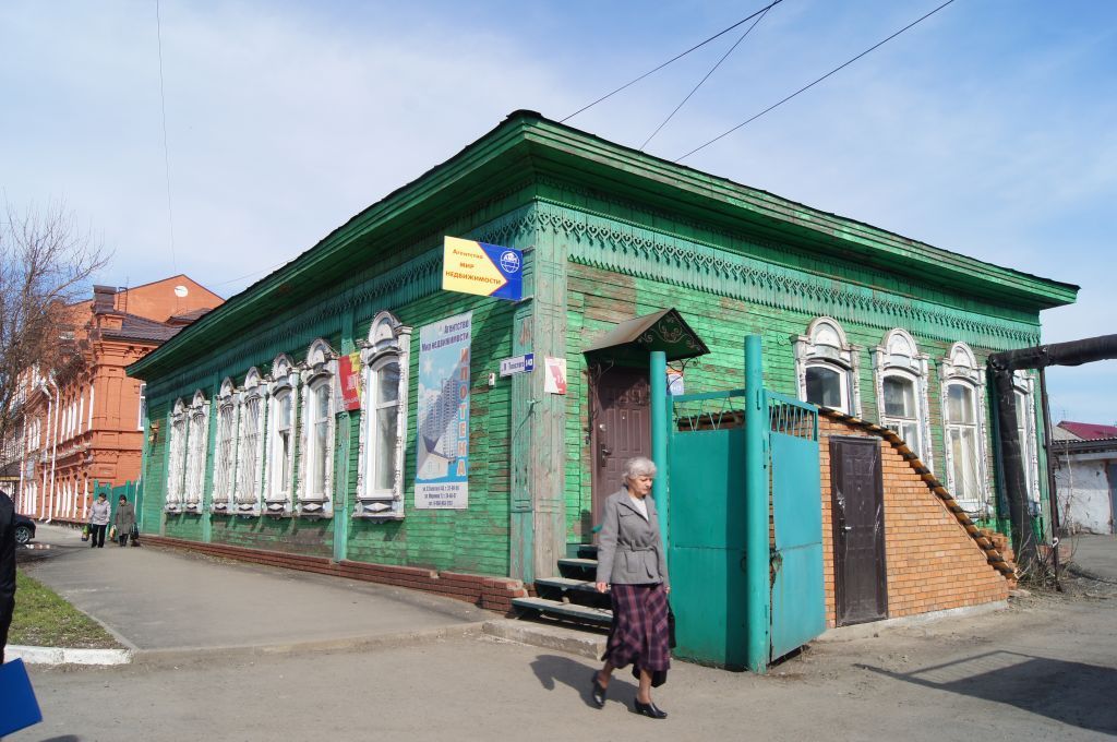 1. Градостроительная характеристика.Здание расположено в исторической части города Бийска, вдоль красной линии улицы Л. Толстого. Главный северо-западный фасад ориентирован на красную линию. 2. Объемно-пространственное решение.Одноэтажное здание с подвалом, основной объем прямоугольной в плане формы, к нему со стороны бокового северо-восточного фасада с небольшим смещением вправо от центральной оси примыкает одноэтажный пристрой. 3. Конструктивные особенности.Стены бревенчатые, рублены с остатком, обшиты профилированным узким горизонтальным тесом. Крыша основного объема вальмовая, четырехскатная, со слуховым выносным окном со стороны дворового фасада, одноэтажного пристроя - односкатная. Покрытие кровли выполнено из листового металла. 4. Композиция и художественное оформление фасадов.Фасады здания венчает карниз большого выноса, подшитый досками и декорированный ленточной пропильной резьбой растительного орнамента. Выступающий фриз набран из вертикальных дощечек, декорированных в верхней части пропильной резьбой. Свесы фриза, огибающие угловые лопатки, украшены сквозной пропильной резьбой в виде цветка крина, над ними узкий поясок из мелких алмазных граней. Углы и места врубок по всем фасадам оформлены лопатками с вертикальными и горизонтальными выпилами. Между лопатками, под свесами фриза, выполнен ряд вертикальных дощечек с завершениями треугольной формы. Оконные проемы здания - лучковой формы, декор наличников по фасадам различен в оформлении. Окна имеют двухстворчатое заполнение Т-образной формы с фрамугами и форточками, расположенной на одной из створок, створки поделены на две неравные части.Композиция главного северо-западного фасада, ориентированного на ул. Л. Толстого, выполнена в девять осей проемов. Крайняя левая ось является дверным проемом, через который осуществляется главный вход в здание. Подоконное пространство и цоколь здания обшиты вертикальными дощечками. Под каждым проемом расположены парные квадратные элементы, в которых дощечки расположены по периметру квадрата с уменьшением к центру. Центральная часть фасада, выделенная лопатками и имеющая четыре оконные оси, акцентирована в уровне кровли аттиковой композицией. Аттики, центральный из которых больше по высоте крайних, выполнены прямоугольной формы с арочными фронтонами и филенками, декорированными накладной пропильной резьбой. Центральный аттик фланкирован маленькими тумбами с кровельками. Углы здания, центральные оси боковых фасадов и две оси дворового юго-восточного фасада, соответствующие крайним аттикам главного фасада, в уровне кровли обозначены парапетными тумбами с филенками и четырехскатными кровельками, между которыми устроено деревянное ограждение. Оконные проемы обрамлены наличниками с полукруглыми завершениями фронтонов и профилированными карнизами. Поле фронтона и карниз украшены глухой резьбой растительного мотива, включающим розу и виноградную лозу. Фартуки, завершенные внизу криволинейным выпилом, декорированы накладной глухой резьбой растительного орнамента. Боковые элементы фартуков, выполненные в виде алмазных граней, дополнены круглыми токарными элементами. Вертикальные элементы наличников украшены накладными токарными полуколонками с перехватами, устроенными на базах с круглыми токарны