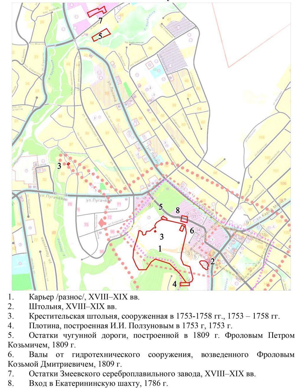 1.Местоположение объекта культурного наследия:Алтайский край, Змеиногорский район, г. Змеиногорск.2.Элементы, формирующие комплекс:«Штольня» - объект культурного наследия регионального значения, расположенныйпо адресу:Алтайский край,Змеиногорскийрайон,г. Змеиногорск / большой рудник (штольня Комисского разноса);«Крестительская штольня, сооруженная в 1753-1758 гг.» - объект культурного наследия регионального значения, расположенный по адресу: Алтайский край, Змеиногорский район, г. Змеиногорск;«Плотина,построеннаяИ.И. Ползуновымв 1753 г.» -объект культурного наследия регионального значения, расположенный по адресу: Алтайский край, Змеиногорский район, г. Змеиногорск (насыпной земляной вал);«Остатки чугунной дороги, построенной в 1809 г. Фроловым Петром Козьмичем» - объект культурного наследия регионального значения, расположенныйпо адресу:Алтайский край,Змеиногорскийрайон, г. Змеиногорск (памятный знак на месте, где начиналась первая в России чугунно-рельсовая дорога);«Карьер /разнос/» - объект культурного наследия регионального значения, расположенный по адресу: Алтайский край, Змеиногорский район, г. Змеиногорск (Змеиногорский рудник и каменный останец горы Змеиной);«Валы от гидротехнического сооружения, возведенного Фроловым Козьмой Дмитриевичем» - объект культурного наследия регионального значения, расположенный по адресу: Алтайский край, Змеиногорский район, г. Змеиногорск;«Остатки Змеевского сереброплавильного завода» - объект культурного наследия регионального значения, расположенный по адресу: Алтайский край, Змеиногорский район, г. Змеиногорск (каменная кладка стен Змеевского сереброплавильного завода);«Вход в Екатерининскую шахту» - объект культурного наследия регионального значения, расположенный по адресу: Алтайский край, г. Змеиногорск (свод из крупных тесанных камней).3.Объемно-пространственные характеристики:Выраженные в микрорельефе земной поверхности сооружения, в том числе внешний облик и внутреннее устройство сооружений, в их ландшафтном окружении. Культурный слой (слой в земле), включающий скрытые в земле сооружения и предметы, на территории объекта культурного наследия.«Плотина, построенная И.И. Ползуновым в 1753 г.» - насыпной земляной вал, длиной 50 м, шириной до 15 м, высотой до 5 м;«Карьер /разнос/» - каменный останец горы Змеиной, в котором расположены сохранившиеся подземные сооружения Змеиногорского рудника и входы шахт и штолен; объемно-пространственные характеристики (длина, ширина, высотные характеристики) и микрорельеф поверхности объекта, который отражает структуру и расположение исторических сооружений Змеиногорского рудника и позволяет обеспечить сохранение скрытых под поверхностью объектов и сооружений рудника;«Вход в Екатерининскую шахту» - сооружение в виде грота (свод из крупных тесанных камней) полукруглой формы с габаритами 9*5 м.4.Историческое значение:«Комплекс памятников Змеиногорского рудника - крупнейшего в XVIII в. в Сибири горно-заводского производства по добыче драгоценных металлов» является горнорудным промышленным комплексом, созданным великими инженерами и изобретателями К.Д. Фроловым, И.И. Ползуновым, П.К. Фроловым. Комплекс представляет интерес с точки зрения памятника истории промышленного освоения Алтая, где созданы и сохранились до наших дней значительные по
