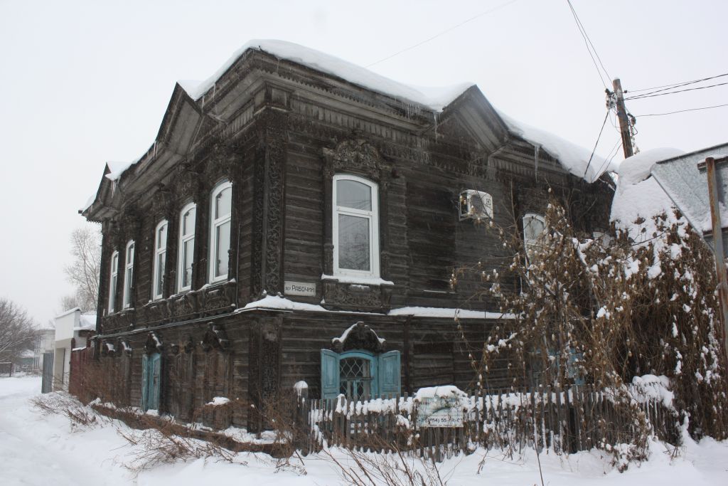 1. Градостроительная характеристика.Здание расположено в исторической части города Бийска, находится на пересечении улицы Л.Толстого и переулка Рабочего.2. Объемно-планировочное решение.Двухэтажное бревенчатое здание с кирпичным цоколем состоит из прямоугольного в плане основного объема и пристроенного со стороны бокового северо-западного фасада двухэтажного каркасного объема сеней под односкатной крышей, где устроена лестничная клетка. Завершает жилой объем вальмовая крыша стропильной конструкции, усложненная в уровне карниза щипцами.3. Конструктивные особенности здания.Бревенчатые стены рублены без остатка, обшиты тесом, четырехскатная крыша с кровлей из листового металла, водосток организованный.4. Декоративное оформление фасадов.Стены завершает развитый карниз украшенный подзором. Опоясывающий здание фриз из вертикальных тесин декорирован пропильной периодически повторяющейся резьбой. По периметру здания проходит междуэтажный профилированный карниз. Углы закрыты лопатками с накладным растительным орнаментом пропильной резьбы.Все оконные проемы лучковой формы имеют Т - образное заполнение с фрамугами, обрамлены наличниками. Окна второго этажа более высокие. Лобани наличников имеют фигурное очертание в завершении в виде волют, украшены элементами объемной накладной в виде виноградной грозди, роз, цветочной розетки, трилистника, завершены токарными рамочками. Украшением здания является обильная глухая резьба подоконных досок в виде растительного орнамента, свитков и вертикально поставленных модульонов. Вертикальные элементы наличников оформленыканнелированными полуколоннами с декоративными резными капителями.Окна первого этажа со ставнями. Лобани наличников в завершении в виде волют, декорированы объемной накладной резьбой в виде роз.Юго-восточный фасад по улице Толстого несимметрично делится пятью осями оконных проемов. Линия карниза симметрично прервана двумя треугольными щипцами с заглубленными тимпанами из вертикальных тесин. Тимпан каждого щипца декорирован накладной резьбой растительного орнамента, карниз украшен подзором.По северо-восточному и юго-западному фасадам пристроенный объем сеней отделен пилястрами с накладным растительным орнаментом, увенчан треугольными аттиками. По северо-восточному фасаду на втором этаже устроен балкон на кованых кронштейнах с резным ограждением.Юго-западный фасад зеркально-симметричен северо-восточному, декор аналогичен за исключением балкона.