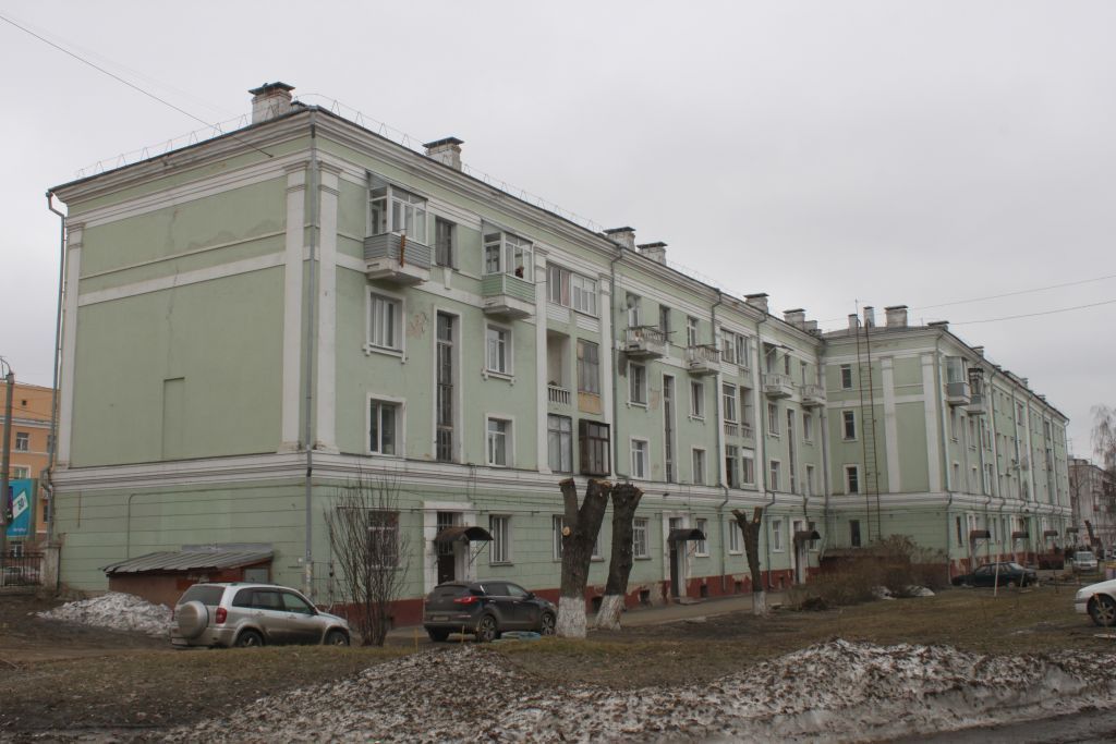 1.Градостроительная характеристика.Здание расположено в рядовой застройке проспекта Калинина.2.Объемно - планировочное решение здания.Четырехэтажное здание с подвалом находится вдоль красной линии проспекта Калинина, состоит из трех прямоугольных в плане сблокированных объемов с выступающими левым и правым флангами относительно центральной части, имеет симметричную объемно-планировочную композицию. В крайних объемах со стороны двора по три входа, а в центральном четыре. В центре симметричной композиции фасадов расположен проезд.3.Конструктивные особенности здания.Стены - кирпичные оштукатуренные. Крыша невысокая вальмовая, покрытие кровли из листового металла. По краю кровли торцевых фасадов установлена кирпичная балюстрада с круглыми бетонными балясинами.4.Декоративное оформление фасадов:Фасады здания оштукатурены и окрашены с добавлением цветного колера, декоративные элементы выделены белым цветом. Плоскости фасадов в уровне первого этажа оформлены квадровым штукатурным рустом. Рустованный первый этаж и остальные плоскости фасадов окрашены в одинаковые тона. Горизонтальное членение фасадов подчеркнуто выделенным фризом и карнизом небольшого выноса, а также широким штукатурным междуэтажным профилированным поясом под окнами второго этажа и прерывающимися поясами из двух тяг .между третьим и четвертым этажами. Плоскость фасадов в уровне второго-четвертого этажей разбита пилястрами. Окна второго и третьего этажей обрамлены рамочными наличниками.Оконные проемы имеют заполнения с шестичастной и девятичастной расстекловкой.Главный юго-восточный фасад здания, ориентированный на проспект Калинина, имеет трехчастную композицию с выступающими левым и правым флангами относительно центрального объема, ось симметрии акцентирована прямоугольным широким сквозным проездом в уровне первого и цокольного этажей. В проезде система основных и вспомогательных балок создают рисунок кессонированного потолка. Над проездом расположен прямоугольный проем, обрамленный арочным штукатурным наличником с имитацией замкового камня. Над проемом, в уровне третьего этажа, располагаются три оси проемов, средний из которых ложный, в уровне четвертого этажа - небольшая горизонтальная ниша с двумя оконными и одним ложным проемами. По обе стороны от проезда на высоту цокольного и первого этажей устроены ложные портики в одну оконную ось. Эта часть фасада в пять оконных осей, завершена в уровне кровли прямоугольным аттиком.Композиция фасада центрального объема по обе стороны от портиков зеркально симметрична, каждая из них сформирована девятью осями проемов. По центру правой и левой сторон от проезда на всю высоту фасада устроены по две лоджии, каждая в две оконные оси, в уровне второго и третьего этажей разделенные колоннами прямоугольного сечения. Оконные проемы лоджий первого этажа обрамлены рамочными наличниками. По обе стороны от лоджий в три оси расположены оконные проемы, на двух в уровне четвертого этажа устроены балконы, третья ось в уровне второго и четвертого этажей выделена пилястрами. Ограждения балконов и лоджий бетонные, с круглыми балясинами, выполнены в едином стиле.Композиция главного фасада левого и правого флангов симметрична, каждая из них сформирована тринадцатью осями проемов. По центральной оси э