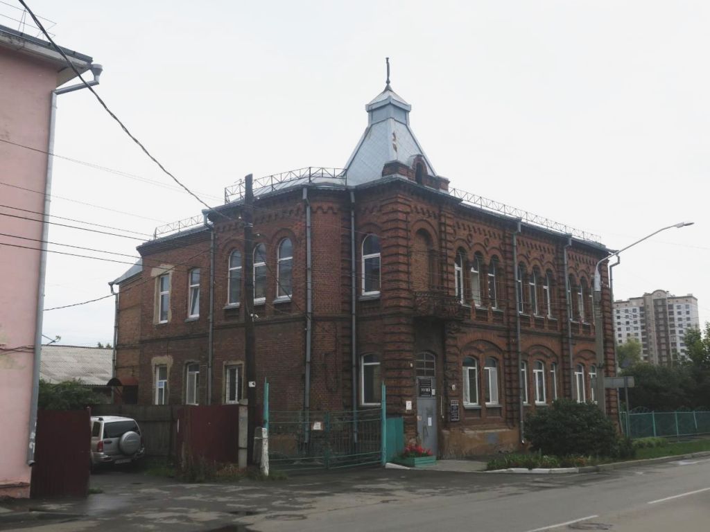 Градостроительная характеристика: Здание расположено в старой части города, главным юго-западном фасадом обращено на красную линию улицы Горького. 2. Объемно-планировочное решение здания на период конец XIX в.: Двухэтажное с подвалом здание, выполненное из красного кирпича лицевой кладки, сложное в плане. В объемной композиции здания выделяется западная угловая часть с двумя ризалитами по юго-западному и северо-западному фасадам. Капитальной внутренняя стена делит интерьер на равные северо-восточнуюи юго-западную части, разделенные в свою очередь на отдельные помещения. Восточный угол занимает естибюль с лестницей, здесь же расположен вход в подвал. План второго этажа почти полностью повторяет план первого. Исключениями являются юго-западная его часть, где находится большой зал,ориентированнный окнами на улицу.3.Конструктивные особенности здания: стены- из красного кирпича лицевой кладки, кровля из листового металла. 4.Декоративное оформмление фасадов: Левый фланг юго-западного фасада акцентирован ризалитов,завершающимся аттиком и высоким шатром со шпилем, являющимся доминантой в композиции. Здесь устроен парадный вход. Дверь двупольная с филенками лекальной формы, выполнена в стиле модерн, над дверью в проеме с лучковой перемычкой имеется небьольшая фрамуга. По оси парадного входа в уровне второго этажа распологается балкон на кронштейнах с кованным ажурным ограждением. Вход на балкон - арочный проем с наличником фланкированный полуколоннами.Основная плоскость юго-западного фасада симметрична и разделена на три части рустованными лопатками. Средняя часть фасада имеет 3 оси проемов. Фланговые - в уровне второго этажа по три оси проемов устроенных с равным шагом, в уровне 1-го этажа - два более широких проема. Окна 1 этажа имеют лучковые перемычки и вписаны в неглубокие арочные ниши, в уровне второго этажа окна-арочные, их наличники в верхней части и полуколонки в простенках объединены в виде аркады, над которой декоративное крашение в виде колец. Под окнами второго этажа имеются зубчики, расположенные в два ряда. Окна с Т-оьбразным переплетом и полуциркульной фрамугой. Ризалит северо-западного фасада имеет скругление углов, три арочных оконных проема с равным шагом устроены только в уровне второго этажа. Плоскость фасада справа от ризалита имеет одну ось. Окно первого этажа имеет клинчатую лучковую перемычку, в уровне второго этажа арочную клинчатую перемычку. Слева от ризалита расположенны в три оси и имеют лучковые перемычки без декоративного оформления. Дворовый северо-восточный фасад, который членится на три части последовательно заглубленных относительно основной плоскости, имеет аналогичные оконные проемы бездекаративного оформления. Юго-восточный фасад первоначально был глухой, являлся брандмауэрной со смежным участком. Декоративное убранство здания также состовляют проходящие по периметру небольшого выноса карниз с зубцами, фриз украшенный арочным мотивом. 5.Интерьеры: двери деревянные с фигурными филенками и фрамугой.