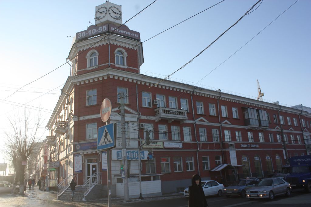 1. Градостроительная характеристика.Здание расположено на пересечении проспекта Строителей и площади Победы, на незначительном перепаде рельефа.2. Объёмно-планировочное решение и габариты здания.Трёхэтажное здание с подвалом имеет угловую композицию фасадов, в плане близкое к Г-образной форме. Является многоквартирным жилым домом со встроенными помещениями общественного назначения, расположенными на первом этаже. Главные входы в нежилые помещения размещены по уличному фасаду крыла ориентированного на пл. Победы, а входы в жилые - со стороны двора. Срезанный угол на пересечении улиц акцентирован восьмиугольным объёмом мезонина в четыре оси.3. Конструктивные особенности.Здание кирпичное, оштукатуренное, перекрытия над подвалом и лестничные площадки из монолитного железобетона. Ступени лестничных маршей наборные из бетона мозаичного состава. Конструкция крыши чердачная, водосток организованный.4. Декоративное оформление фасадов.Фасады здания оштукатурены, окрашены в терракотовой гамме, декоративные элементы выделены белым цветом. По главным фасадам стены здания завершает профилированный карниз с сухариками. Второй и третий этажи разделяет штукатурный тянутой формы междуэтажный пояс, а под окнами второго этажа проходит широкий пояс из двух тяг. Прямоугольные окна - с расстекловкой в 6 квадратов, делят фасады с равным шагом. Окна третьего этажа по всем фасадам дополнены подоконными полочками. Плоскости фасадов в уровне первого этажа и угловой части фасада, включая мезонин, оформлены квадровым штукатурным рустом с выделением замков над проемами. Декоративное убранство уличных фасадов более насыщено. В уровне кровли установлен парапет в виде бетонной балюстрады, фланговые части которой акцентированы парапетными тумбами на пьедесталах с небольшими шарами.Угловой объём здания со срезанным углом в уровне первого и третьего этажей фланкирован ризалитами небольшого выноса в одну ось, декорированными в уровне верхнего междуэтажного пояса треугольными фронтонами, в уровне нижнего балюстрадами. Угол здания завершён мезонином, в плане восьмиугольной формы, служащий основанием невысокому круглому столбу с восьмигранной муфтой, на гранях которой закреплены циферблаты часов. Столб увенчан шпилем с флюгером, на котором просечены цифры «1975» и прикреплена пятиконечная звезда в круге. Карниз мезонина декорирован двумя рядами сухариков, над ним размещено балюстрадное ограждение, аналогичное главным фасадам. Окна мезонина с полуциркульными перемычками обрамлены наличниками, верхняя часть которых решена в виде архивольтов на импостах и дополнена подоконными полочками. В нижней части проёмы объединены тягой.Юго-восточный фасад здания, расположенный вдоль проспекта Строителей, в девять осей проемов, имеет симметричную композицию. Центральная его ось в уровне кровли отмечена прямоугольным слуховым окном с двенадцатичастной расстекловкой, оформленным в виде ступенчатого аттика с треугольным фронтоном и двумя декоративными волютообразными завитками. По центральной и фланговым осям фасада в уровне первого и второго этажей устроены ризалиты. Оконные проемы ризалитов второго этажа фланкированы рустованными пилястрами, поддерживающими антаблементы, и увенчаны треугольными фронтонами в уровне междуэтажного пояса.