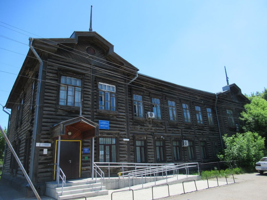1. Градостроительная характеристика.Здание расположено в г. Славгороде на пересечении улиц Карла Либкнехта и Калинина. Главным северо-западным фасадом выходит на красную линию улицы К. Либкнехта. 2. Объемно-пространственное решение.Двухэтажное здание на кирпичном цоколе, прямоугольной в плане формы с ризалитами небольшого выноса, выступающими по флангам главного северо-западного фасада. 3. Конструктивные особенности.Стены бревенчатые, рублены без остатка. Перекрытия плоские по деревянным балкам. Крыша вальмовая четырехскатная, над ризалитами - двускатная, ограниченная фигурными фронтонами, разорванными в уровне карниза. Выступающий цоколь здания кирпичный, оштукатурен и окрашен фасадными красками. Покрытие кровли выполнено из листового металла. 4. Композиция и художественное оформление фасадов.Стены здания венчает карниз небольшого выноса, подшитый горизонтальными досками. Углы здания фиксируют гладкие лопатки, декорированные профилированной рейкой. Широкие и узкие прямоугольные оконные проемы здания обрамлены наличниками с прямыми сандриками. Поля фронтонов наличников и фартуки, завершенные треугольными элементами в нижней части, декорированы накладным геометрическим узором. Вертикальные элементы выполнены со свесами и украшены в верхней и нижней частях накладными элементами в виде алмазных граней, в уровне фронтона - ушками. Широкие окна выполнены с трехстворчатым остеклением и фрамугой разделенной на четыре равные части, центральная створка разделена на две равные части, крайние - на три неравные части. Узкие окна имеют Т-образной формы расстекловку с фрамугой, разделенной на три равные части, каждая из створок разделена на три неравные части.Главный северо-западный фасад, ориентированный на улицу К. Либкнехта, имеет симметричную композицию. Фланги фасада выделены ризалитами небольшого выноса, выполненными в две оси проемов каждый, завершенными в уровне кровли разорванными в уровне карниза фронтонами с остроконечными шпилями. В тимпанах фронтонов, обшитых в елочку, имеются круглые слуховые окна, обрамленные круглыми наличниками со свесами. Крайняя ось левого ризалита в уровне первого этажа акцентирована входным проемом с двупольной дверью и козырьком на стойках, повторяющим форму верхней части фронтона и завершенным остроконечным шпилем. Перед входом устроено прямоугольное крыльцо. Центральная часть фасада выполнена в шесть осей оконных проемов, разделенных лопатками в уровне второго этажа на три равные части, в уровне первого - на две.Боковой юго-западный фасад выполнен в три оси оконных проемов на втором этаже и в четыре оси на первом. По центральной оси фасада, расположенной с небольшим смещением вправо и выделенной лопатками в уровне двух этажей, расположены широкие окна. На третьей оси в уровне первого этажа расположен дверной проем с крыльцом, дверь двупольная филенчатая с фрамугой, разделенной на четыре части.Дворовый юго-восточный фасад выполнен в двенадцать осей оконных проемов и разделен на четыре неравные части узкими лопатками. В крайней левой части, в уровне первого этажа, расположено два узких невысоких проема, во второй части, в уровне двух этажей, четыре проема, в двух других - по три.Боковой северо-восточный фасад, ориентированный на улицу Калинина, выполнен в три оси оконных пр