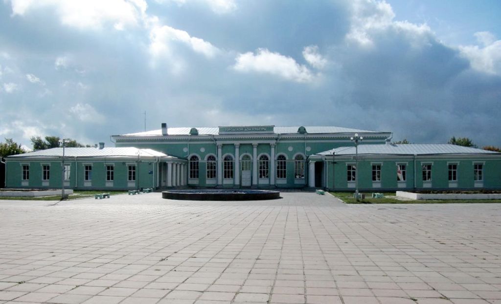 1. Градостроительная характеристика.Здание расположено по центральной оси квартала в границах улиц Ленина и Гагарина, Верещагина и Первомайской. Главным северо-западным фасадом формирует южную границу площади. 2. Объемно-планировочное решение и габариты здания.Одноэтажное здание дома культуры имеет симметричное объемно-планировочное решение, обусловленное общей стилистикой. К высокому прямоугольному в плане объему симметрично примыкают крылья, образуя по главному фасаду небольшой курдонер. Пониженные объемы крыльев по торцевым фасадам, обращенным в сторону курдонера, дополнены открытыми галереями, в местах которых организованы входные узлы.Центральный объем по северо-западному фасаду формируют высокий зрительный зал со сценой и объемный вестибюль, над которым устроен этаж служебных помещений. Юго-восточный фасад сформирован менее высокими помещениями, где по центральной оси находится фойе зрительного зала, имеющее два выхода на террасу. По флангам фасада в виде ризалитов размещены объемы вспомогательных помещений. Планировка крыльев здания коридорного типа, по двум сторонам устроены различные помещения для работы творческих коллективов.По флангам основного объема имеются подвальные помещения.3. Конструктивные особенности здания.Стены кирпичные, оштукатуренные.Крыша чердачная с кровлей из листового металла. Водосток организованный.4. Декоративное оформление фасадов.Декоративное оформление фасадов представлено штукатурным и лепным декором с использованием классических форм. Фасады здания окрашены в охристой гамме, декор выделен белым цветом.По периметру всех объемов здания проходят фриз, отделенный поясом и карниз небольшого выноса, обработанные тянутыми профилями. Карниз центрального объема дополнен модульонами упрощенной формы. По периметру здания устроен невысокий выступающий цоколь, прерывающийся в местах террас и крылец.Главный северо-западный фасад сформирован возвышающимся основным объемом и низкими симметрично расположенными крыльями, в шесть оконных осей каждое. Крылья выступают относительно основной плоскости фасада. Центральная часть фасада, образованная пространством между крыльями, имеет семь осей высоких арочных проемов и акцентирована портиком трехчетвертных колонн с лепными коринфскими капителями. Три пролета портика завершены невысоким прямоугольным аттиком. По центральной оси организован выход из зрительного зала. По сторонам от портика над междуоконными простенками размещено по две круглые ниши. Арочные окна дополнены подоконными нишами с обрамлением тянутой формы и ахивольтами, соединенными штукатурным поясом в уровне фрамуг. Пояс перетекает в венчающий карниз, примыкающих к центральной части галерей и самих крыльев здания. Четырехпролетные галереи примыкают к основному объёму здания, каждая образована четырьмя колоннами тосканского ордера. Ниши прямоугольных окон внутри галереи оживляют фасад балюстрадным заполнением. Прямоугольные окна крыльев здания оформлены подоконными нишами с балюстрадным заполнением, по главному фасаду дополнены прямыми сандриками со свесами, имитирующими кронштейны.Юго-восточный фасад также решен симметрично, имеет многоплановость за счет возвышающегося основного объема зрительного зала, пониженного объема помещений фойе и 