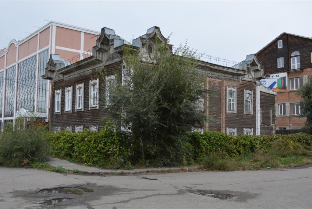 1. Градостроительная характеристика.Здание расположено в исторической части города на пересечении улицы Красногвардейской и переулка Коммунарского.2. Объемно-планировочное решение и габариты здания.Двухэтажное деревянное здание в плане приближено к квадрату. По центральной оси основного объема проходит коридор. Планировка этажей идентична. Входы в здание устроены через пристроенные объемы, которые по высоте ниже основного и расположены на северо-западном и северо-восточном фасадах. 3. Конструктивные особенности здания.Бревенчатые стены рублены без остатка и обшиты тесом. Цоколь кирпичный.Крыша основного объема четырехскатная, покрытие кровли – листовой металл.4. Декоративное оформление фасадов.Здание имеет угловую композицию фасадов с акцентами по главным уличным фасадам. Стены венчает большого выноса карниз, украшенный ажурной резьбой. Высокие с криволинейным завершением щипцы расположены по флангам главных фасадов, увенчаны шпилями с шаровидными элементами, в тимпанах имеют слуховые окна арочной формы. В основу композиции их оформления входят накладные детали с декоративной ажурной накладной резьбой. Под карнизом проходит фриз, декорированный накладной резьбой.Юго-восточный и юго-западный фасады решены в пять оконных проемов.На северо-восточном фасаде с правого фланга организован вход в здание через пристроенный объем, оборудованный лестницей. С левого фланга - две оси оконных проемов. На первом этаже оконные проемы прямоугольные с Т – образным заполнением, имеют ставни. Фронтоны наличников треугольной формы, украшены объемной резьбой в виде виноградной лозы с гроздьями.На северо-восточном фасаде фронтоны треугольной формы с периодически повторяющимися криволинейными элементами и филенками в основании. Окна второго этажа более вытянутые с лучковым завершением с Т – образным рисунком заполнения. По главным фасадам фронтоны наличников трапециевидной формы и фартуки наличников декорированы растительным орнаментом в виде виноградной лозы и розой в центре композиции. Боковые накладные элементы наличников выделены токарными полуколоннами. Наличники северо-западного и северо-восточного фасадов имеют упрощенное оформление. На северо-западном фасаде на крайней оси фронтон наличника отличается криволинейным завершением в виде волют, декоративное оформление аналогичное с остальными.На северо-западном фасаде оконный проем по левой оси и на северо-восточном - два проема имеют иное декоративное убранство: фронтоны завершены криволинейными элементами в виде волют, с периодически повторяющимися треугольными элементами и филенками в основании, боковые элементы выделены фигурными полуколоннами.Декоративные элементы фасадов выделены светлым колером.Общая оценка общественной, научно-исторической и художественной значимости памятникаОбъект культурного наследия является примером городского деревянного жилого дома начала ХХ в., выполненного в формах эклектики.