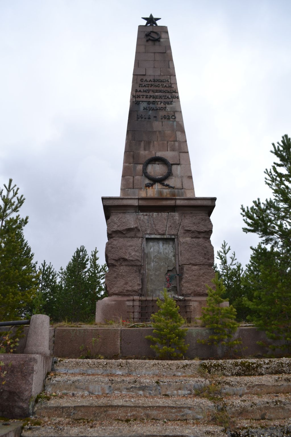 Предмет охраны объекта культурного наследия (памятника истории и культуры) народов Российской Федерации федерального значения«Монумент, сооруженный в память жертв интервенции периода гражданской войны 1918-1920 гг.» в составе объекта культурного наследия (памятника истории и культуры) народов Российской Федерации федерального значения «Памятники острова Мудьюг», расположенного по адресу: Архангельская область, Приморский район, пос. МудьюгГрадостроительные характеристики объекта культурного наследия (памятника истории и культуры) народов Российской Федерации федерального значения «Монумент, сооруженный в память жертв интервенции периода гражданской войны 1918-1920 гг.» (далее – объект культурного наследия «Монумент, сооруженный в память жертв интервенции периода гражданской войны 1918-1920 гг.»)Местоположение и градостроительные характеристики объекта культурного наследия «Монумент, сооруженный в память жертв интервенции периода гражданской войны 1918-1920 гг.» – в южной оконечности острова Мудьюг, в юго-западной части Мудьюгского концентрационного лагеря, лицевым фасадом к Двинской губе Белого моря.Роль объекта культурного наследия «Монумент, сооруженный в память жертв интервенции периода гражданской войны 1918-1920 гг.» в композиционно-планировочной структуре объекта культурного наследия (памятника истории и культуры народов Российской Федерации федерального значения «Памятники острова Мудьюг».Архитектурные и конструктивные характеристикиОбъемно-пространственная композиция объекта культурного наследия «Монумент, сооруженный в память жертв интервенции периода гражданской войны 1918-1920 гг.»: сооружение из гранита, чугуна и бетона общей высотой 24,5 м.На двухступенчатой земляной призме (в основании 30 х 30 метров) – обелиск из гранитных блоков высотой 19,5 м, увенчанный пятиконечной звездой диаметром около одного метра.Бетонные ступени, ведущие к обелиску с четырех сторон, обрамленные гранитными блоками, нижняя земляная призма обнесена каменными круглыми в сечении столбиками, между которыми перекинуты чугунные цепи, верхняя призма – чугунное ограждение по таким же столбикам.Композиционное решение и архитектурно-художественное оформление монумента: на лицевой части стелы обелиска мемориальная надпись – «Славным патриотам, замученным интервентами на острове Мудьюг. 1918 – 1920», над надписью – изображение серпа и молота, ниже – венок из лавровых и дубовых ветвей, перевитых алой лентой.Материал и характер отделки монумента.