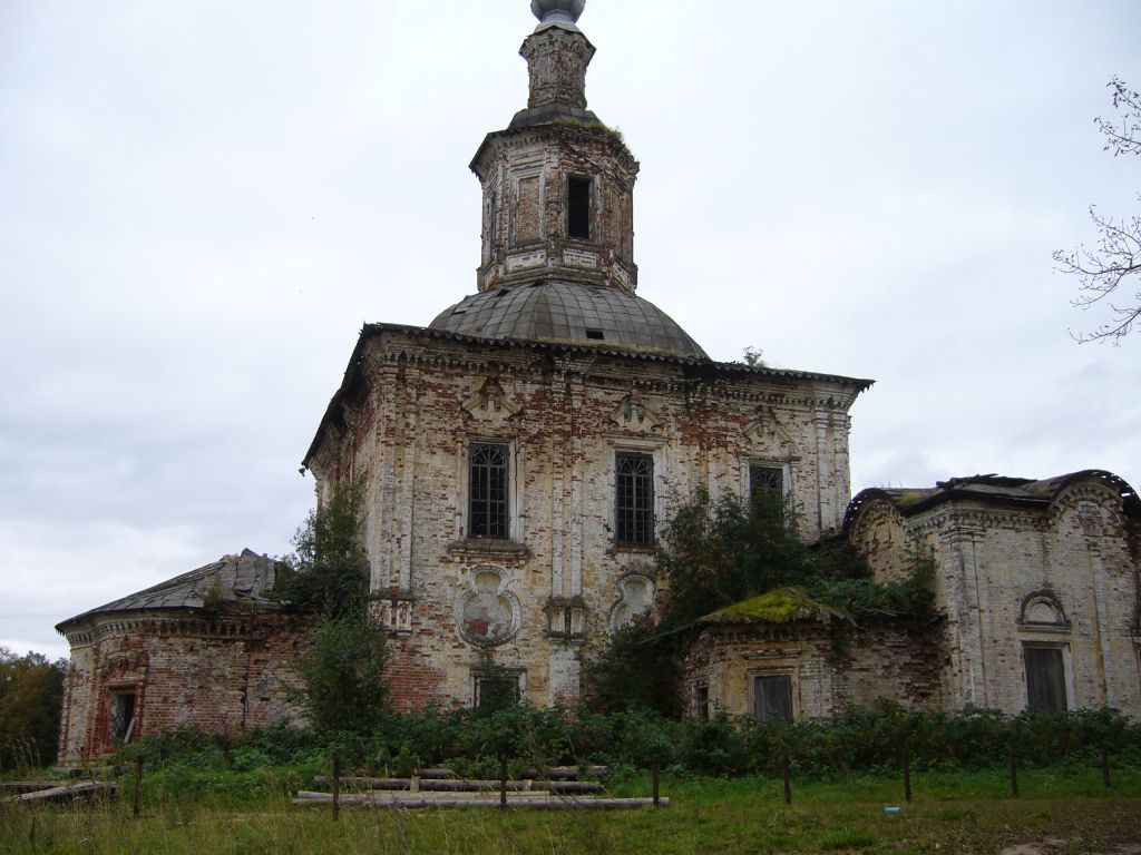 Предмет охраны объекта культурного наследия (памятника истории и культуры) народов Российской Федерации федерального значения «Троицкая церковь (дер.)», 1731 г., расположенного по адресу: Архангельская область, Красноборский район, с. Черевково, ул.Первомайская, д.23 аГрадостроительные характеристики объекта культурного наследия (памятника истории и культуры) народов Российской Федерации федерального значения «Троицкая церковь (дер.)» (далее – объект культурного наследия «Троицкая церковь (дер.)»)Местоположение – в центральной части села Черевково, на главной улице села – Первомайской, под незначительным углом к красной линии ул. Первомайской, с отступом к берегу реки Северной Двины.Габариты, силуэт.Секторы и направления видовых раскрытий, визуальные связи объекта культурного наследия «Троицкая церковь (дер.)».Композиционная роль объекта культурного наследия «Троицкая церковь (дер.)» в структуре окружающего природного и культурного ландшафта.Архитектурные и конструктивные характеристикиОбъемно-пространственная и планировочная композиция здания, сформировавшаяся к 1765 году, представляющая собой сложную композицию разновысотных объемов: - бесстолпный двухсветный четверик основного храма под восьмигранным куполом со световым восьмериком 2-го яруса, покрытым меньшим куполом, несущим главу на высоком глухом восьмеричке – барабане, и примыкающая к четверику с востока апсида с восточной стеной, имеющей в плане вид трех соединенных дуг неправильной формы; - примыкающая с запада к четверику прямоугольная в плане трапезная; - примыкающая с запада к трапезной пятиярусная колокольня с притвором в нижнем ярусе, крытая куполом, увенчанным высоким шпилем на высоком глухом восьмеричке – барабане; - боковые приделы, примыкающие с севера и юга к трапезной основного храма с выделенными по высоте кубическими объемами храмов, имеющими завершения, аналогичные основному храму, низкими гранеными апсидами, частично закрывающими фасады основного четверика, и низкими притворами, не имеющими самостоятельных наружных выходов; - параметры, форма глав и крестов. Строительные конструкции: - конструкция сводов: нижний ярус основного храма перекрыт стянутыми у основания железными связями, сомкнутым восьмигранным сводом со световым отверстием в центре, восьмерик второго яруса – вспарушенным сводом, апсида – лотковым сводом с распалубками над оконными и дверными проемами; основное помещение приделов перекрыто глухим сомкнутым сводом, апсиды и притворы – лотковым сводом с распалубками над окнами и арками проходов; - конструкция и форма восьмеричков - барабанов главного и придельных храмов, колокольни;- конструкция и форма распалубок, лотков, перемычек над проемами; - материал и техника кладки цоколя, стен, сводов, арок, перемычек. Композиция и архитектурно-художественное оформление фасадов: - фасады основного храма выполненные в стиле развитого «нарышкинского» барокко рубежа XVII-XVIII веков с элементами «узорочья» второй половины XVII века: пилястры, подчеркивающие грани объемов; пышные наличники высоких окон верхнего света (колонки по сторонам проемов, опирающиеся на кронштейны; сандрики с характерными гребешками и бобышками); сложный многообломный раскрепованный карниз с поясом модульонов; колонки в наличниках окон верхнего света (глад