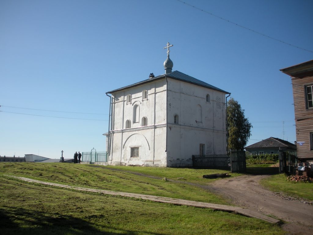 Градостроительные характеристики объекта культурного наследия (памятника истории и культуры) народов Российской Федерации регионального значения «Колокольня надвратная с церковью Святого Духа Успенского монастыря», 1865-1866 гг., (далее – объект культурного наследия «Колокольня надвратная с церковью Святого Духа Успенского монастыря») Местонахождение объекта культурного наследия «Колокольня надвратная с церковью Святого Духа Успенского монастыря»: на возвышенности – исторической искусственной насыпи («городок»), в южной части с. Холмогоры.Композиционная роль объекта культурного наследия «Колокольня надвратная с церковью Святого Духа Успенского монастыря» в застройке исторической территории с. Холмогоры («городок»).Габариты, силуэт, сложившиеся на дату строительства – 1865-1866 гг.Секторы и направления видовых раскрытий, исторически сложившийся масштаб окружающей застройки, рельеф местности.Архитектурные и конструктивные характеристикиОбъемно-планировочная структура и архитектурное решение объекта культурного наследия «Колокольня надвратная с церковью Святого Духа Успенского монастыря» на дату строительства – 1865-1866 гг.: конфигурация и габаритные размеры плана по внешнему контуру (длина – 10,66 м, ширина – 10,61 м);объемно-пространственная композиция, представляющая собой квадратный в плане двухъярусный объем.Габариты и расположение наружных капитальных кирпичных стен.Относительные высотные отметки верхнего уровня стен, исторических оконных и дверных проемов.Композиционное архитектурно-художественное оформление фасадов:количество, осевое расположение, конфигурация и размеры исторических оконных и дверных проемов на фасадах:по одному прямоугольному оконному проему в нижнем ярусе в центре северного фасада и в восточной части южного фасада, арочные проемы верхнего яруса в центре северного и восточного фасадов;следы заложенных исторических оконных и дверных проемов, проездных арок;декоративное оформление фасадов (материал исполнения – кирпич):вертикальное членение фасадов – гладкие лопатки по углам объема и по две лопатки на каждом фасаде по сторонам широкой центральной части;горизонтальное членение фасадов – межъярусный карниз, дополненный штукатурными обломами и пояском полувала; декоративный пояс из полувала по периметру объема верхнего яруса;карниз верхнего яруса, образованный выпуском белокаменных плит;архивольты в виде полувала, отмечающие перемычки исторических арочных проемов сквозного проезда на восточном и западном фасадах нижнего яруса;архивольт в виде полувала, отмечающий перемычку исторического южного арочного оконного проема на западном фасаде верхнего яруса.Виды отделки фасадной поверхности: штукатурка, побелка.Конструктивные элементы (материал, конструкция, техника исполнения):цоколь из белокаменных пиленых блоков:стены кирпичные;исторические следы утраченных конструкций перекрытий, лестницы (штрабы, гнезда).