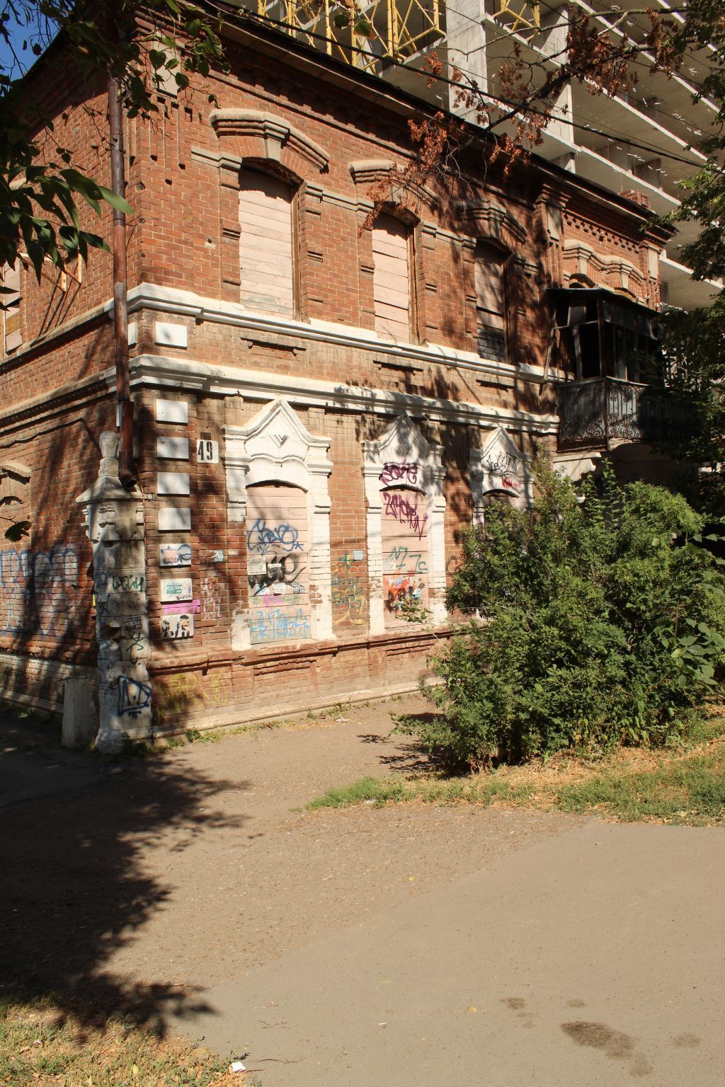 №п/пОписание предмета охраны1.Месторасположение Объекта – здание, расположенное по адресу: Республика Башкортостан, г. Уфа, ул. Чернышевского, д. 49.2.Объемно-пространственное решение Объекта – вытянутое вглубь квартала Г-образное в плане здание, состоящее из двух примыкающих друг к другу объемов, выстроенных в разное время и имеющих равную высоту;четырехскатная вальмовая крыша над квадратном в плане объемом (более ранним по времени строительства и именуемым в дальнейшем главным), главным фасадом, выходящим на красную линию ул. Чернышевского.3. 3.1.Композиционное решение и декоративное убранство Объекта:юго-западный фасад Объекта.Главный фасад выходит на красную линию ул. Чернышевскогои ориентирован на юг. Фасад обильно декорирован фигурной кирпичной кладкой; цоколь - профилированный белый камень (известняк). Угловые лопатки декорированы оштукатуренными кирпичными накладками на первом этажеи орнаментом, выложенным из кирпича, с фигурной оштукатуренной накладкой в верхней части - на втором. На фасаде по 5 окон на каждом этаже. Композиция фасада ассиметрична, что достигается выделением 4-го и 5-го окон каждого этажа при помощи крайней правой и средней лопаток,а также балкона второго этажа; балкон имеет фигурную в плане форму плиты, нижняя поверхность которой представляет собой два коробовых свода, и опирающуюся на фигурные консоли белого камня; кованная балконная решетка; окна главного фасада – прямоугольныес лучковой перемычкой в 1 кирпич шириной с выделенным камнем; фронтоны каменных наличников 1-го, 2-го и 3-го окон первого этажа имеют форму треугольника с острым верхним углом. Поле фронтона занимает волнообразная кирпичная кладка, центр - ромбовидный элемент из белого камня; наличники окон второго этажа являются как бы логическим продолжением окон первого этажа по вертикали. Перемычки - также лучковые с ярко выраженным замковым камнем. Наличник завершается профильной кирпичной кладкой, повторяющей форму перемычки. Этим элементом объединены балконная дверь и 5-е окно второго этажа. Стойки наличников по вертикали разбиты горизонтальными выступающими рядами кирпичной кладки. По вертикали фасад расчленен междуэтажным и подоконными поясами, выложенными из кирпичаи оштукатуренными; междуэтажным поясом с ширинками, расположенными по осям оконных проемов; горизонтальным поясом, проходящим вдоль всего фасадана уровне пяты перемычек оконных проемов второго этажа; поясом с прямоугольными ширинками, проходящим между цоколем и подоконным карнизом. Карниз - ступенчатый; орнамент, выполненный с помощью кирпичной кладки, над 1-3 окнами отличается от орнамента над балконом (между лопатками). Выносная плита выполненаиз известняковых плит. 3.2.Северо-западный и северно-восточный фасады Объекта:дворовой имеет протяженную формуи состоит из фасадов двух объемов - главного, выступающего \"ризалитом\" на плоскости фасадной стены,и позднего, вытянутого вглубь двора. Оконные перемычки западного фасада главного объема – лучковые с выраженным замковым камнем, наличники - с ушками, на вершине - ступенчатая кирпичная кладка. Междуэтажный и подоконный пояса, выполненные из кирпича, а также гладкий междуэтажный пояс.Северо-западный фасад объема, вытянутого вглубь квартала: оконные перемычки - лучковые с выраженным замковым камнем, налични