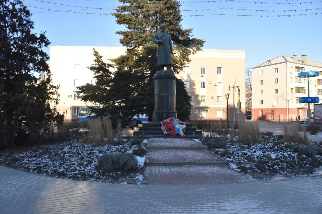 Объемно - пространственная композиция памятника, в том числе фигура И.Р. Апанасенко, отлитая из бронзы, в полный рост на цилиндрическом постаменте и четырехступенчатом стилобате облицованном мрамором. Постамент, декорированный поясками и лавровым венком, опоясывающим нижний уровень. Мемориальная надпись на постаменте \"ГЕНЕРАЛ АРМИИ АПАНАСЕНКО\"