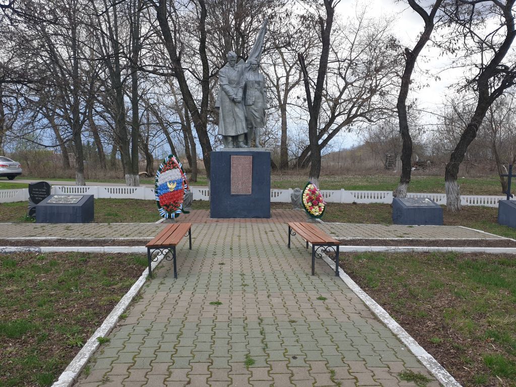 Имеющееся захоронение, существующее местоположение, текст мемориальной надписи и фамилии погибших советских воинов, высеченные на мемориальных плитах.