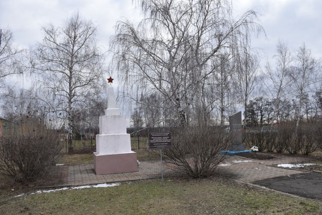 Объемно-пространственная композиция памятника, в том числе обелиск, увенчанный красной пятиконечной звездой, установленный на трехступенчатом постаменте; имеющееся захоронение; фамилии погибших советских воинов, расположенные на мемориальной доске.