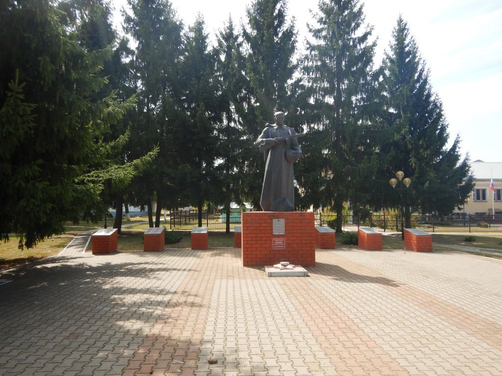 Существующее местоположение, скульптура советского воина, выполненная в меди, в ее существующих объемно-пространственных параметрах, текст мемориальной надписи и фамилии погибших советских воинов, а также фамилии воинов земляков, не вернувшихся с фронтов Великой Отечественной войны, высеченные на мемориальных плитах.