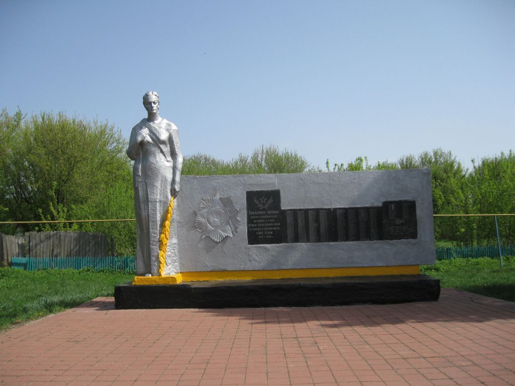 Объёмно-пространственная композиция памятника, в том числе скульптура женщины, держащей в левой руке колосья, и мемориальная стена, размещённые на общем постаменте; текст мемориальных надписей \"Благодарные потомки - воинам-односельчанам, погибшим в годы Великой Отечественной войны за свободу и независимость нашей Родины 1941-1945 гг.\" и \"Самые отважные солдаты были те, что не пришли домой, в день Победы, в мае, в сорок пятом, став навеки Родиной самой\"; фамилии воинов земляков, не вернувшихся с фронтов Великой Отечественной войны, расположенные на мемориальных досках.