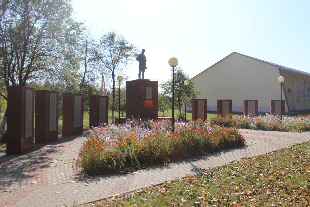 Объемно-пространственная композиция памятника, включая выполненную в полный рост скульптуру \"Советский воин с автоматом\", установленную на двухступенчатом постаменте; мемориальная доска с надписью \"Вечная память нашим односельчанам, павшим в боях за Родину 1941-1945 гг. Помним и скорбим\"; мемориальные доски с фамилиями погибших советских воинов, размещённые на отдельно стоящих стелах.
