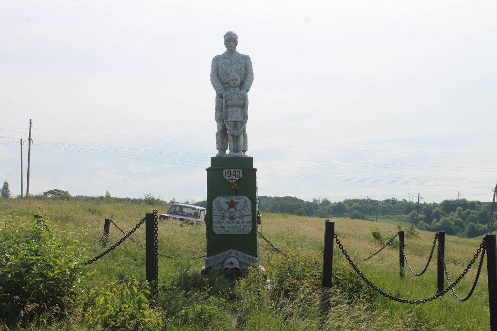Имеющееся захоронение, существующее местоположение, текст мемориальной надписи. Двухфигурная скульптура советского воина с ребенком в ее существующих объемно - пространственных параметрах.