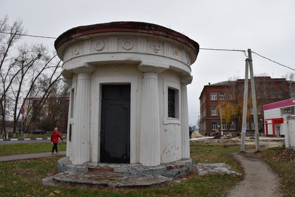 Объёмно-планировочная композиция ротондального здания, перекрытого полуциркульным сводом, ориентированного главным входом на запад; габариты и конфигурация крыши; количество, расположение и форма оконных и дверных проёмов.Композиция и архитектурно-художественное оформление фасадов: цоколь, выделенный большей толщиной стены; полуколонны дорического ордера; антаблемент, включающий: узкий архитрав, отделенный полочкой от фриза с триглифами и метопами, украшенными декоративными фигурами; профилированный карниз большого выноса; рамочные наличники с ушками, обрамляющие оконные и дверные проёмы.Высотные и силуэтные характеристики здания.Материал лицевой поверхности стен и декора - керамический кирпич.Декоративные металлические решетки с растительным орнаментом в оконных проёмах.