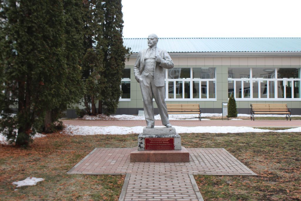 Объемно-пространственная композиция памятника, в том числе фигура В.И. Ленина в полный рост, расположенная на квадратном постаменте и гранитном стилобате.
