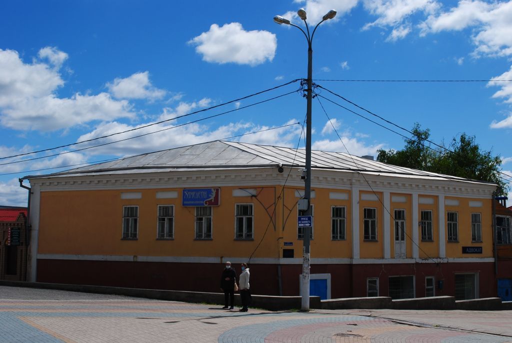 Объемно-планировочная композиция вытянутого по продольной оси прямоугольного в плане, со срезанной под 30° торцевой (уличной) стеной, двухэтажного здания; высотные и силуэтные характеристики здания; габариты и конфигурация крыши, материал кровельного покрытия - металл; количество, расположение и форма оконных и дверных проемов.Композиция и архитектурно-художественное оформление фасадов: широкая междуэтажная полочка; прямоугольные ниши над окнами 2-го этажа; широкий профилированный карниз с сухариками (главный и торцевой уличный фасады); узкий карниз большого выноса (торцевой и дворовый фасады); деревянная веранда торцевого и дворового фасадов; лопатки; контрфорсы Материал стен и декора - керамический кирпич, дерево (веранда).Стены оштукатурены и окрашены в терракотовый, желтый (стены) и белый (архитектурные детали) цвета.