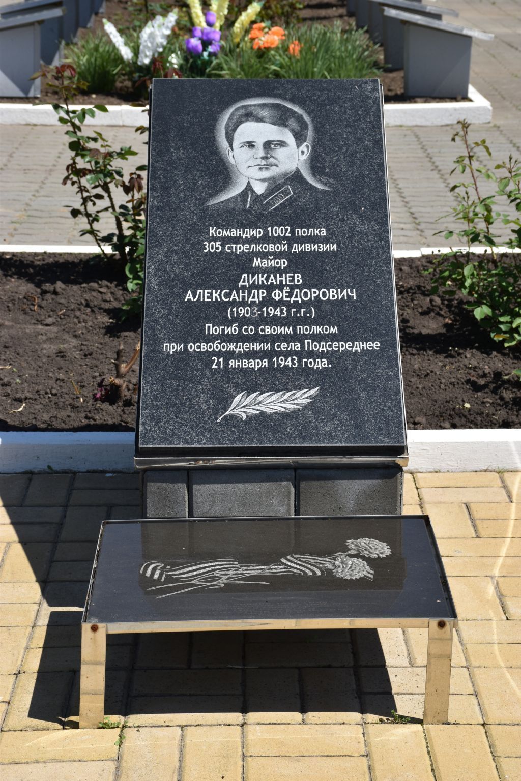 Могила Диканева Александра Федоровича (1903-1943), командира 1002 полка 305 дивизии, погибшего в боях с фашистами в 1943 году, за освобождение Алексеевского района. Обелиск