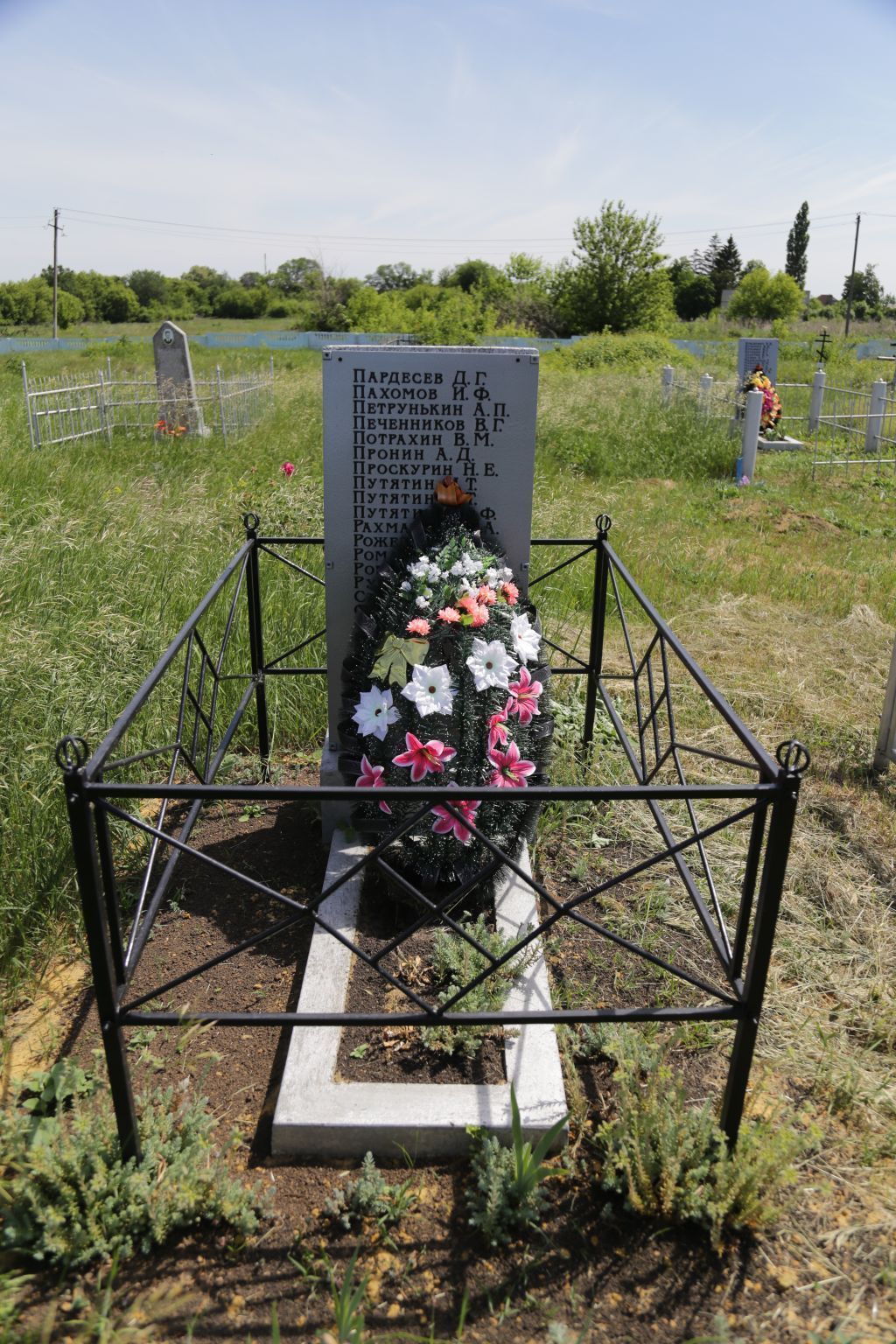 Имеющееся захоронение, существующее местоположение, фамилии погибших советских воинов, высеченные на мемориальной плите.