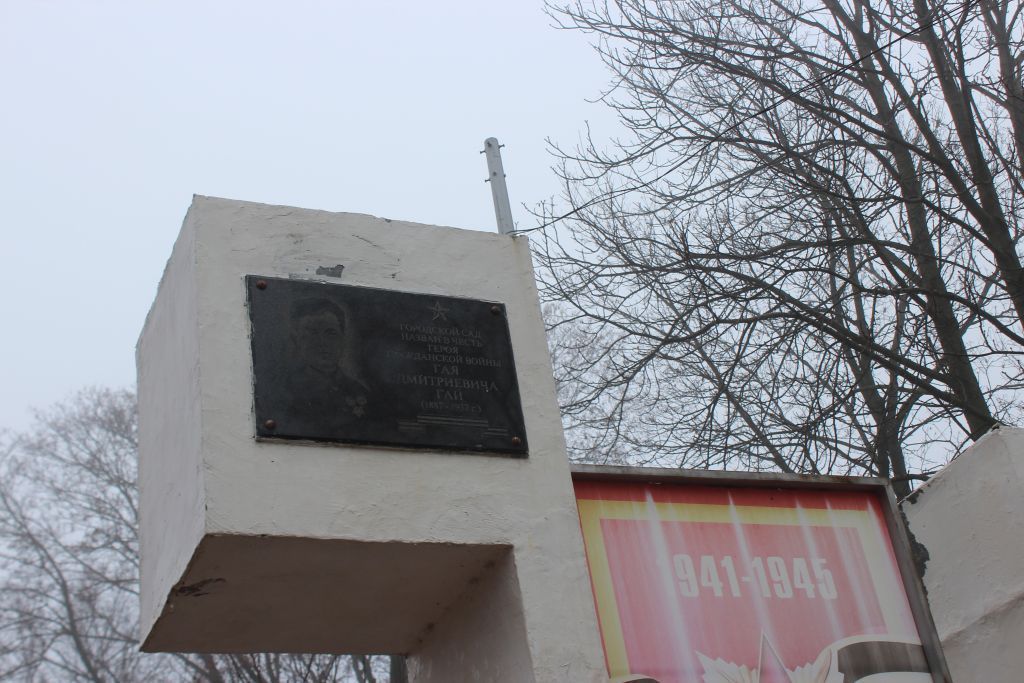 Мемориальная доска из натурального камня, включая её текст \"Городской сад назван в честь героя Гражданской войны Гая Дмитриевича Гай (1887-1937 г.)\" и графическое изображение Г.Д. Гая; местоположение мемориальной доски на территории парка.