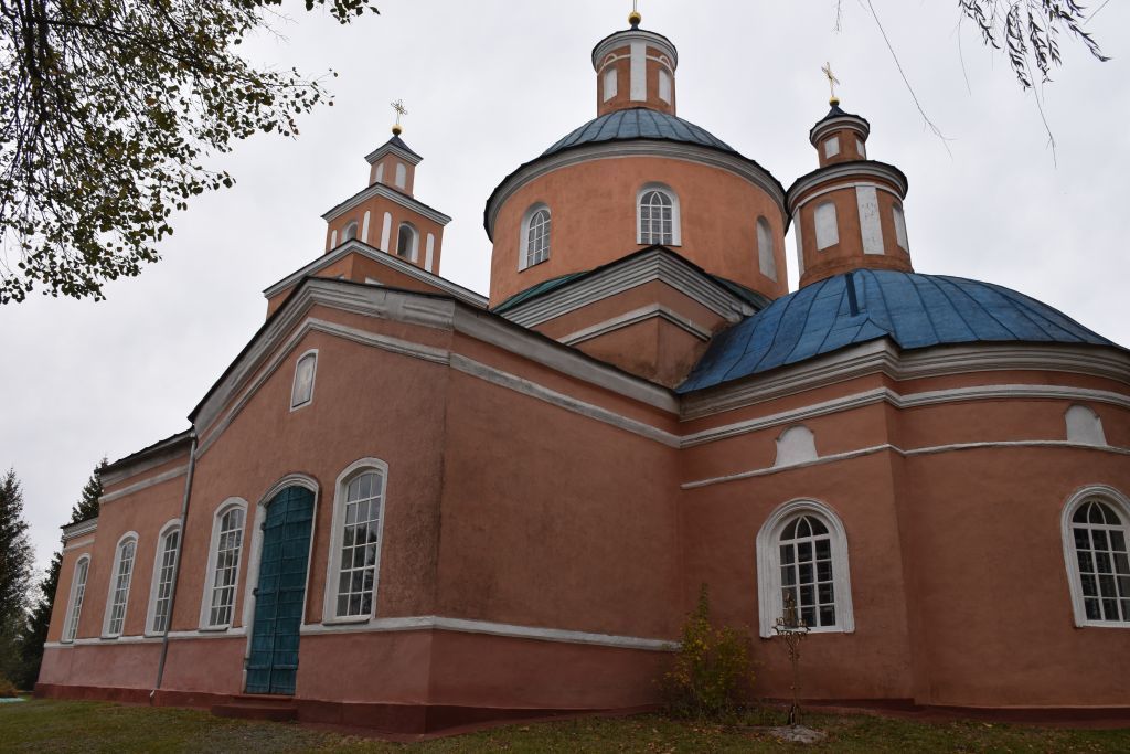 Местоположение объекта, являющегося высотной доминантой улицы Понизовье.Объёмно-пространственная композиция каменного, трёхнефного крестово-купольного здания, с массивным цилиндрическим световым барабаном, четырёхъярусной колокольней, одночастной апсидой сложной формы (прямоугольной в месте примыкания к четверику храма и полукруглой в завершении), высотные отметки по венчающим карнизам, количество, форма и расположение оконных и дверных проёмов.Габариты и конфигурация крыш, в том числе пологий купол центрального барабана с небольшим барабанчиком завершённым конусным шатром и главкой, скатные крыши ярусов колокольни с завершающим невысоким шатром и главкой, двухскатные крыши трапезной и приделов, четырёхскатная крыша четверика храма, сложной формы крыша апсиды с двумя барабанчиками, поставленными один на другой, шатром и маленькой главкой, высотные отметки по подкрестным яблокам и конькам.Высотные и силуэтные характеристики здания. Композиция и архитектурно-художественное оформление фасадов: профилированная полочка, отделяющая цоколь от остальной части стен на всех фасадах за исключением апсиды; профилированная полочка в верхней части стен апсиды с нишками барочной формы над ней по осям оконных проёмов апсиды; гладкий фриз, ограниченный снизу профилированной полочкой, сверху профилированным венчающим карнизом на апсиде, притворах, четверике храма, трапезной, барабанах апсиды, маленьком барабане светового барабана храма; профилированный венчающий карниз на всех ярусах колокольни, в том числе на внутренней части стен 1-го яруса, световом барабане храма; лопатки с вертикальными нишами с полуциркульным верхним краем на фасаде западного придела храма; ниши с полуциркульным завершением и нишками барочной формы над ними по обеим сторонам высокого проёма с полуциркульным завершением 1-го яруса колокольни; накладная доска барочных форм над дверным проёмом главного (западного) фасада; вертикальные прямоугольные ниши по обеим сторонам арок звона 2-го яруса колокольни; вертикальные ниши с полуциркульным верхним краем по обеим сторонам проёмов 3-го яруса колокольни; нишки с полуциркульным завершением на 4-м ярусе колокольни; гладкие лопатки на маленьких барабанах апсиды и светового барабана, нишки с полуциркульным завершением на маленьком барабане светового барабана храма и полуциркульным декором над ними; ленточное профилированное обрамление оконных и дверных проёмов.Материал и характер отделки фасадных поверхностей второй половины XVIII века (кирпич, окраска по штукатурке) (цветовое решение уточняется в процессе реставрационных исследований).Пространственно-планировочная структура интерьеров здания в пределах капитальных стен и перекрытий, включая сводчатые.Архитектурно-художественное оформление интерьеров: профилированное обрамление дверных проёмов; круглые печи в юго-восточной и северо-западной частях храма с декорированными чугунными печными дверцами в нижней части; ленточное обрамление арочных конструкций храма, оконных проёмов (за исключением проёмов светового барабана), профилированный карниз в верхней части светового барабана.Характер оформления и рисунок расстекловки оконных заполнений.