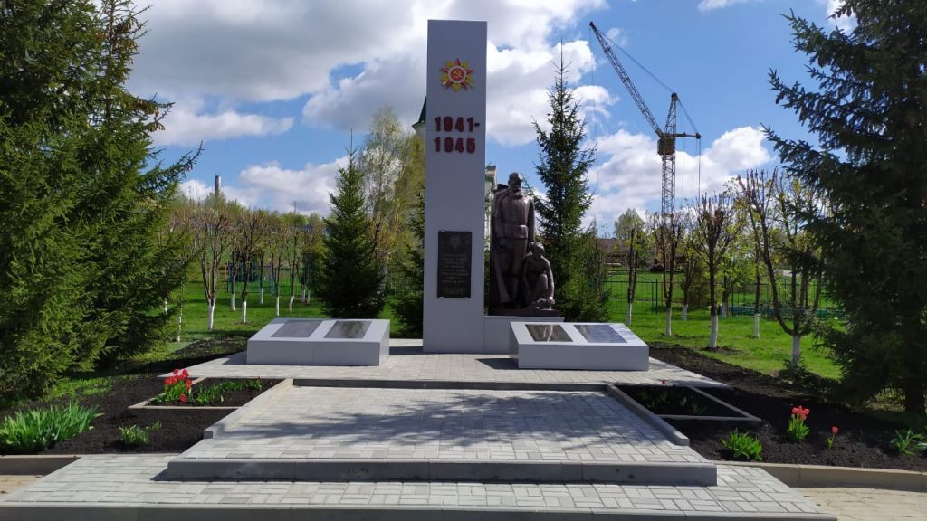 Объёмно-пространственная композиция памятника, в том числе стела и два подиума с гранитными мемориальными досками; скульптура \"Воин и девушка, преклонившая колено\", расположенная на постаменте; текст мемориальной надписи \"1941-1945 СЛАВА ВАМ ХРАБРЫЕ, СЛАВА БЕССТРАШНЫЕ, ВЕЧНУЮ СЛАВУ ПОЕТ ВАМ НАРОД. ДОБЛЕСТНО ЖИВШИЕ, СМЕРТЬ СОКРУШИВШИЕ ПАМЯТЬ О ВАС НИКОГДА НЕ УМРЕТ!\", фамилии погибших советских воинов, высеченные на мемориальных досках; элемент символики - Орден \"Отечественная война\" и надпись: \"1941-1945\"; имеющееся захоронение.