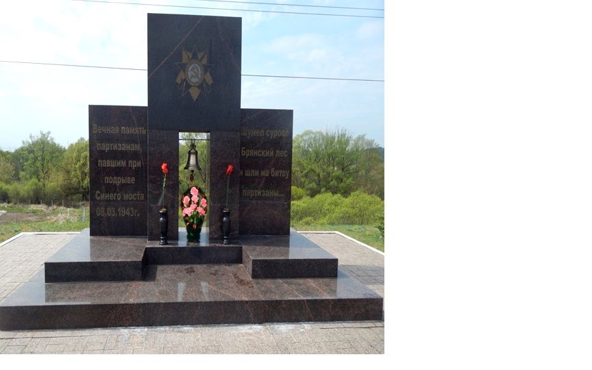 Памятное место "Голубой мост", где в 1942 г. партизанским отрядом бригады "Смерть немецким оккупантам" и партизанской бригадой им. Кравцова под общим командованием Героя Советского Союза М.П. Ромашина был уничтожен гарнизон фашистов и взорван железнодорож