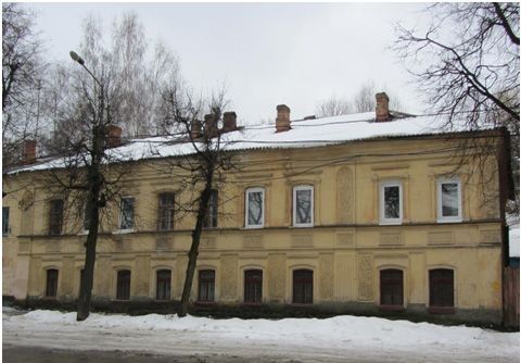 1 .Объемно пространственное построение основного объемаОсновной объем ограничен центральным, дворовым, и двумя боковыми фасадамиДвухэтажное кирпичное и оштукатуренное здание, прямоугольное в плане с трехскатной кровлей кровлей. Принадлежит к характерным для архитектуры Брянска 1-й трети 19в. жилым домам, выполненным еще в стиле раннего классицизма. Северная пристройка выполнена в 1870-80-х гг., южная сооружена в сер. 20в.2.Форма и оформление оконных проемов 1 -го этажаЦентральный фасад, 1-й этаж.Окна с лучковыми перемычками, обрамлены штукатурными наличниками, увенчанными сандриками.3. Междуэтажный поясокЦентральный фасадРитмичный ряд филенчатых нишек, обработанных под шубу, штукатурная филенчатая надоконная тяга образуют широкий междуэтажный поясок.4,Оконные нишиВнутренние помещения.Лучковые окна расположены в нишах.5. Форма межкомнатных дверных проемовВнутренние помещенияЛучковые межкомнатные двери расположены в нишах.6. Окна, пилястры Дворовый фасадДворовый фасад частично сохранил прежние формы: рустованные пилястры членят его на три части, средняя из которых в три окна, а боковые в два. Окна лучковые, без обрамлений.