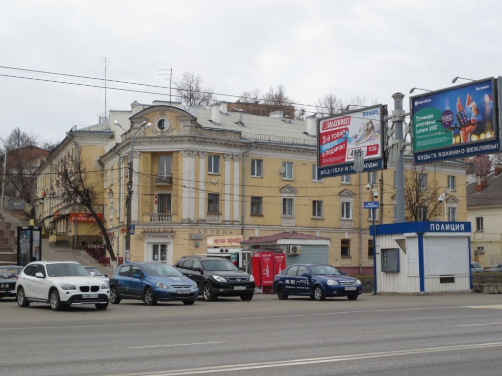 1. Объемно-пространственное композиционное построение основного объема здания со всеми фасадами: трехэтажное здание состоит из двух корпусов - прямоугольного и Г-образного в плане со срезанным углом. Ввиду особенностей рельефа корпуса возвышаются один над другим. Здание кирпичное оштукатуренное и побеленное, декоративные элементы выделены белым цветом.Форма и расположение входного узла: Прямоугольный дверной проем расположен в нише в первом этаже срезанной части фасада.Сандрик: над нишей дверного проема расположен прямоугольный сандрик на консолях, опирающийся на профилированное перекрытие.Крупные прямоугольные окна: высокие прямоугольные окна расположены по четыре от входа. Обрамления окон выполнены в виде заглубленной рамки с замковым камнем. Уровень подоконника совпадает с уровнем цоколя.Окна: простые прямоугольные окна в шесть осей продолжают ритм окон фасада по ул.Калинина. Обрамления окон выполнены в виде заглубленной рамки с замковым камнем. В подоконье расположены филенчатые нишки.Руст: первый этаж здания рустован