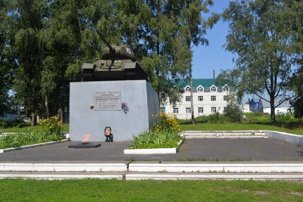 Памятный знак - танк, установленный в честь воинов 12-й и 21-й армий Брянского фронта, стоявших насмерть на дальних подступах к Москве в октябре 1941 г.