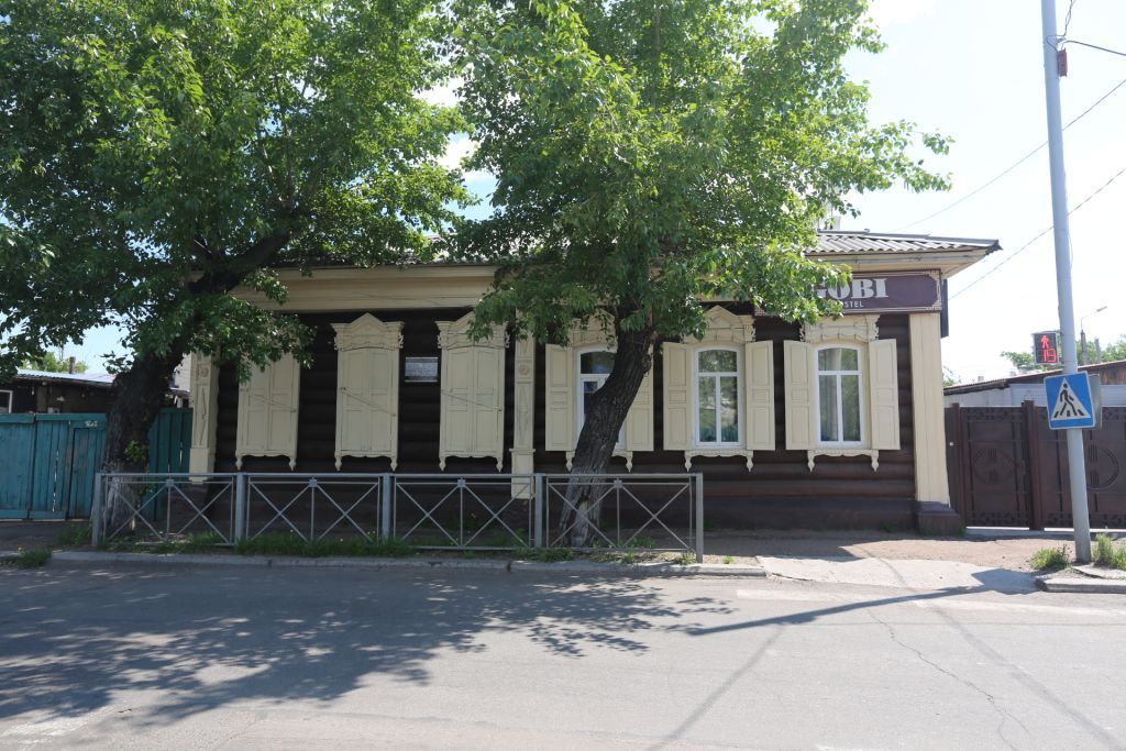 1.Местоположение объекта: Дом расположен в исторической части города на южной стороне улицы Банзарова, фиксирует красную линию застройки северным фасадом2.Объемно-планировочное решение: Одноэтажный, прямоугольный в плане, разделен внутренней несущей стеной на две равные половины3.Строительные конструкции и материал: Наружные и несущие внутренние стены.Материал: дерево4.Конфигурация кровли Конфигурация: вальмовая5.Декоративные элементы фасадов:5.1.Карниз, его местоположение, конфигурация и материалМестоположение: по периметру.Конфигурация: профилированный небольшого выноса. Материал: дерево5.2.Фриз, его местоположение, конфигурация и материалМестоположение: по периметру.Конфигурация: из гладких досок, горизонтально ступенчато расположенных, стык фриза с карнизом закрыт пояском. Материал: дерево5.3.Оконные проемы, их местоположение, конфигурация и количествоМестоположение: северный, западный, восточный фасады. Конфигурация: с лучковой перемычкой. Количество: 12 (северный фасад – 6, западный – 3, восточный – 3)5.4.Наличники, их местоположение, конфигурация, декор, количество и материал Местоположение: северный и восточный фасады. Конфигурация: повторяют форму окна. Декор: доска лобани наличников декорирована рельефной резьбой типа «полотенце с кистями». Лобань завершает профилированный карниз типа «фронтон с отворотами наружу». Фартук криволинейной формы с боковыми каплевидными свесами. Количество: 9 (северный фасад – 6, восточный – 3). Материал: дерево5.5.Ставни, их местоположение, конфигурация, количество и материалМестоположение: северный и восточный фасады. Конфигурация: повторяют форму окна, двустворчатые трехчастные филенчатые. Количество: 9 (северный фасад – 6, восточный – 3). Материал: дерево5.6.Зашивка выпусков бревен, ее местоположение, конфигурация, декор, количество и материал Местоположение: северный и восточный фасады. Конфигурация: зашивка из гладких досок, вертикально расположенных. Декор: профилированные пояски, имитирующие пилястры; зашивка выпусков северного фасада декорирована накладными элементами объемной резьбы. Количество: 4 (восточный фасад - 2, северный - 2). Материал: дерево