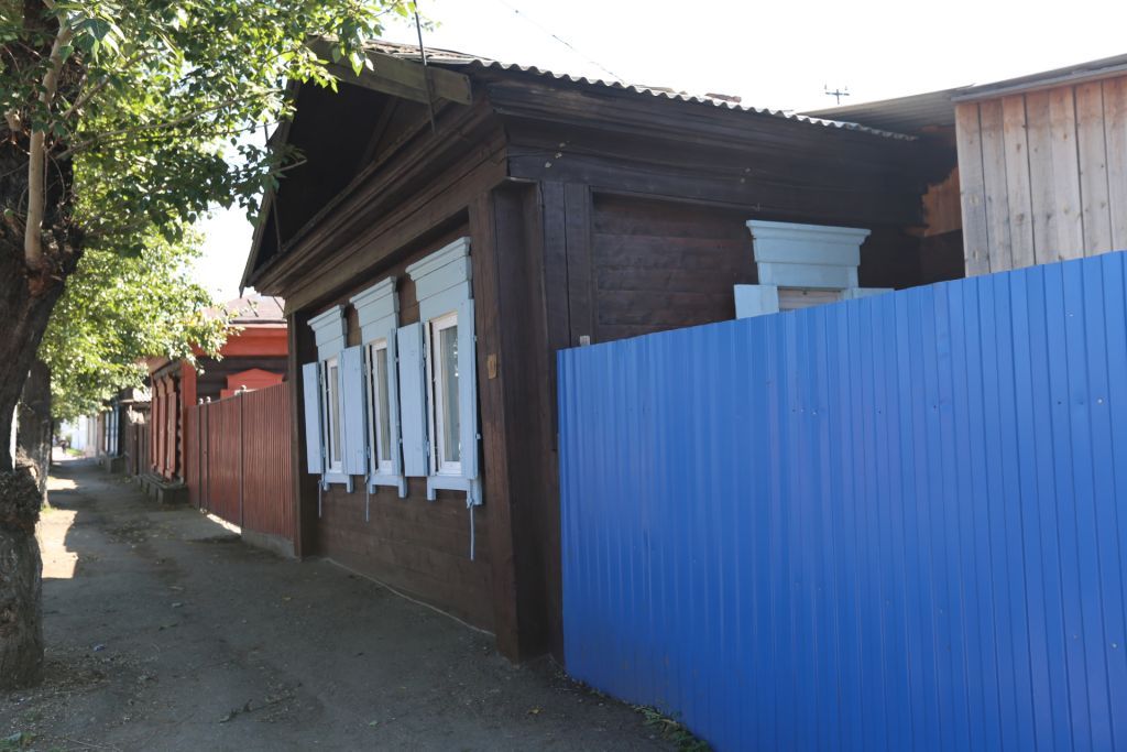 1. Местоположение объекта: Дом расположен в исторической части города на южной стороне улицы Банзарова, фиксирует красную линию застройки северным фасадом2. Объемно-планировочное решение: Одноэтажный, прямоугольный в плане, вытянут вглубь участка.3. Строительные конструкции и материалНаружные и несущие внутренние стены.Материал: дерево4. Конфигурация кровли. Конфигурация: двухскатная с фронтонами по торцам5.Декоративные элементы фасадов:5.1Карниз, его местоположение, конфигурация и материал.Местоположение: по периметру.Конфигурация: профилированный небольшого выноса. Материал: дерево5.2 Фриз, его местоположение, конфигурация и материал.Местоположение: по периметру.Конфигурация: из гладких досок, горизонтально ступенчато расположенных.Материал: дерево5.3 Оконные проемы, их местоположение, конфигурация и количествоМестоположение: северный, западный, южный и восточный фасады. Конфигурация: прямоугольные. Количество: 8 (северный фасад – 3, западный – 2, южный – 2, восточный – 1)5.4 Наличники, их местоположение, конфигурация, декор, количество и материал Местоположение: северный, западный, южный и восточный фасады. Конфигурация: повторяют форму окна.Декор: лобань из двух ступенчато уложенных досок завершает горизонтальный профилированный карниз. Свесы прямоугольные. Количество: 8 (северный фасад – 3, западный – 2, южный – 2, восточный – 1).Материал: дерево5.5 Ставни, их местоположение, конфигурация, количество и материалМестоположение: северный и западный фасады. Конфигурация: повторяют форму окна, двустворчатые дощатые.Количество: 5 (северный фасад – 3, западный – 2). Материал: дерево5.6 Зашивка выпусков бревен, их местоположение, конфигурация, количество и материалМестоположение: выпуски бревен северо-восточного и северо-западного углов.Конфигурация: зашивка гладкими вертикально расположенными досками. Количество: 4 (северо-восточный угол - 2, северо-западный угол - 2). Материал: дерево5.7 Зашивка северного фасада и части западного фасада, ее местоположение, конфигурация и материалМестоположение: северный фасад и северная часть западного фасада.Конфигурация: гладкой доской, уложенной горизонтально. Материал: дерево
