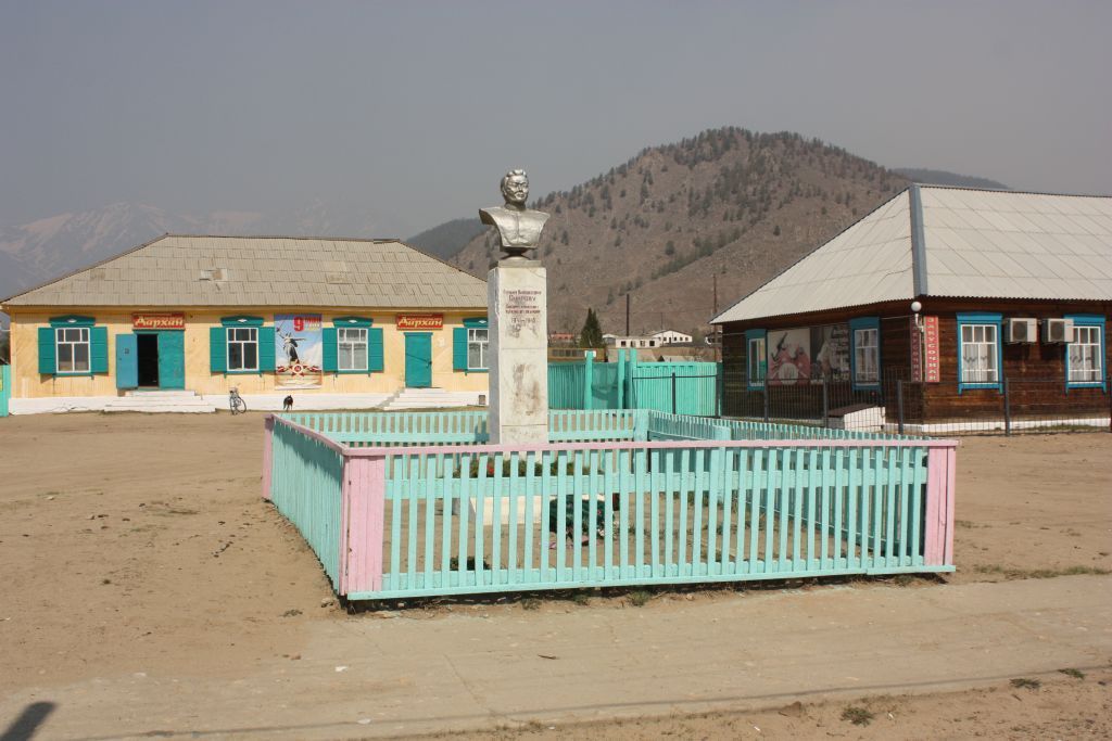 1. Местоположение. 2. Бюст Очирова Г.В. на высоком постаменте.