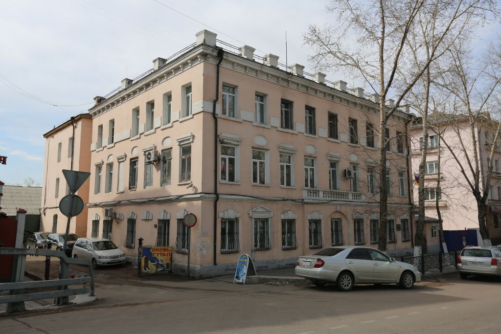 1. Местоположение: на южной стороне ул. Куйбышева (бывш. Троицкая) и фиксирует линию застройки главным северным фасадом.2. Объемно-планировочное решение здания:2.1. Этажность: трехэтажное. 2.2 Планировочное решение: Прямоугольный в плане.3. Конфигурация кровли. Вальмовая.4. Строительные конструкции и материал: наружные и внутренние несущие стены материал: кирпич, оштукатуренный.5.1. Междуэтажный пояс его местоположение, конфигурация, и материал: Восточный, северный и западный фасады. Часть южного. Между 1 и 2 этажамиПрофилированный. Кирпичный, оштукатуренный.5.2. Ризалит его местоположение, конфигурация. Северный фасад. Первый этаж. По центру северного фасада трехосный ризалит высотой до междуэтажного пояса.5.3. Арочная ниша его местоположение, конфигурация, декор и материал. Северный фасад. Первый этаж, ризалит.По центру ризалита арочная полуциркульная ниша в оси ниши сверху декоративный трапециевидный элемент, имитирующий замковый камень, кирпичный, оштукатуренный.5.4. Декор северного фасада его местоположение, конфигурация, и материал. Северный фасад. Второй этаж над ризалитом. Рельеф, имитирующий, «балюстраду» над ризалитом (в ширину ризалита). «Балюстрада» состоит из четырехгранных опор (4) между которыми устроены фигурными «балясины» (4-10-4). кирпичный, оштукатуренный.5.5. Оконные проемы их местоположение, конфигурация:Восточный, северный и западный фасады. Прямоугольные, высокие. Северный фасад - девятиосный, восточный и западный - семиосные, Северный фасад - 18 оконных проемов (из них 1 в арочной нише), восточный - 14 (из них 3 заложены), западный - 14 (из них 5 заложены, 1 проем на 1 этаже превращен в дверной).5.6. Сандрики первого этажа тип 1 их местоположение, конфигурация, материал:Восточный, северный и западный фасады. 1 этаж.Гладкий широкий, в центре трехчастный элемент, состоящий из трех трапециевидных деталей, имитирующих замковый камень, кирпичные, оштукатуренные. Северный фасад - 6, восточный фасад - 7, западный - 7.5.7. Наличники и сандрики первого этажа тип 2 их местоположение, конфигурация:Северный фасад. 1 этаж. Трехсторонний наличник венчает «фронтон» с углубленным «тимпаном» и профилированным карнизом. Боковые части деревянные, окрашены. Кол-во - 2.5.8. Надоконный декор 2 этажа его местоположение, конфигурация, и материал:Восточный, северный и западный фасады. 2 этаж. Над оконными проемами два вида декора, чередующиеся между собой. 1) сандрик - двухступенчатый прямоугольный элемент с двумя прямоугольными свесами, венчает гладкий прямоугольный элемент по ширине равный оконному проему. Кирпичный, оштукатуренный 2) овальные ниши. Сандрики: Восточный фасад - 4, северный - 5, западный - 4. общее кол-во 13 Ниши: восточный фасад - 3, северный - 4, западный - 3. общее кол-во - 10.5.9. Ниши цоколя их местоположение, конфигурация. Северный и восточный фасады, цоколь. В оси проемов в уровне цоколя, прямоугольные ниши. Северный фасад - 9, восточный - 5. общее кол-во - 14.